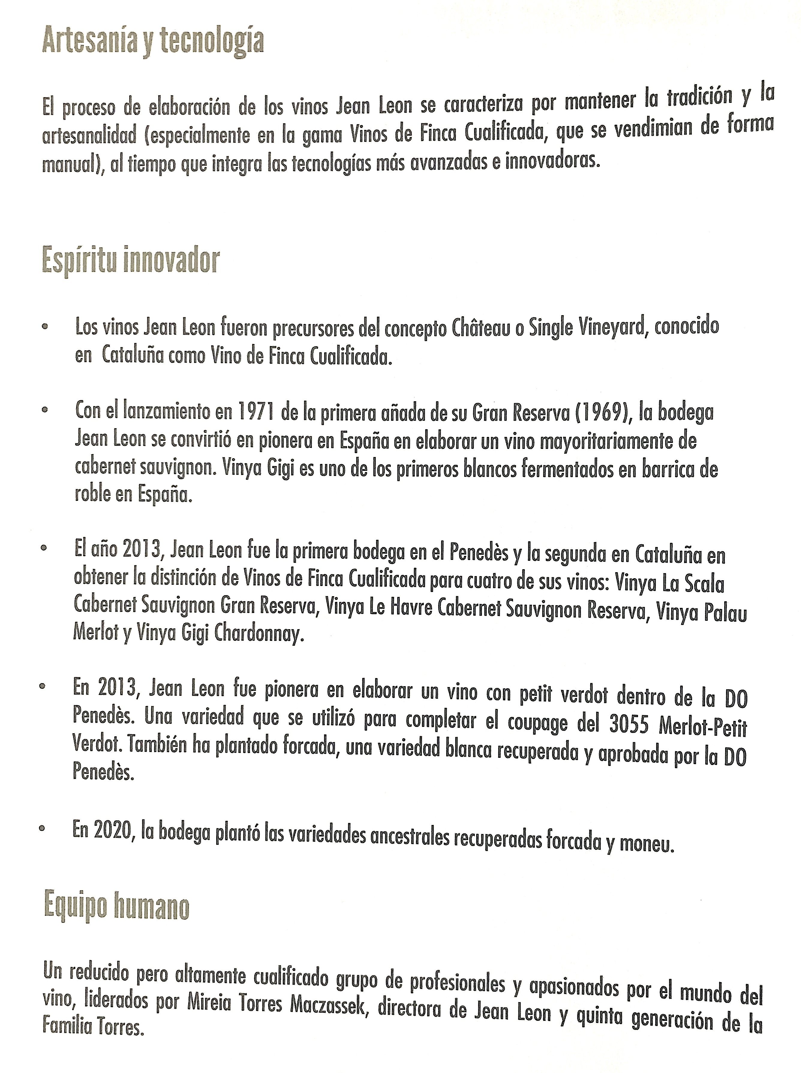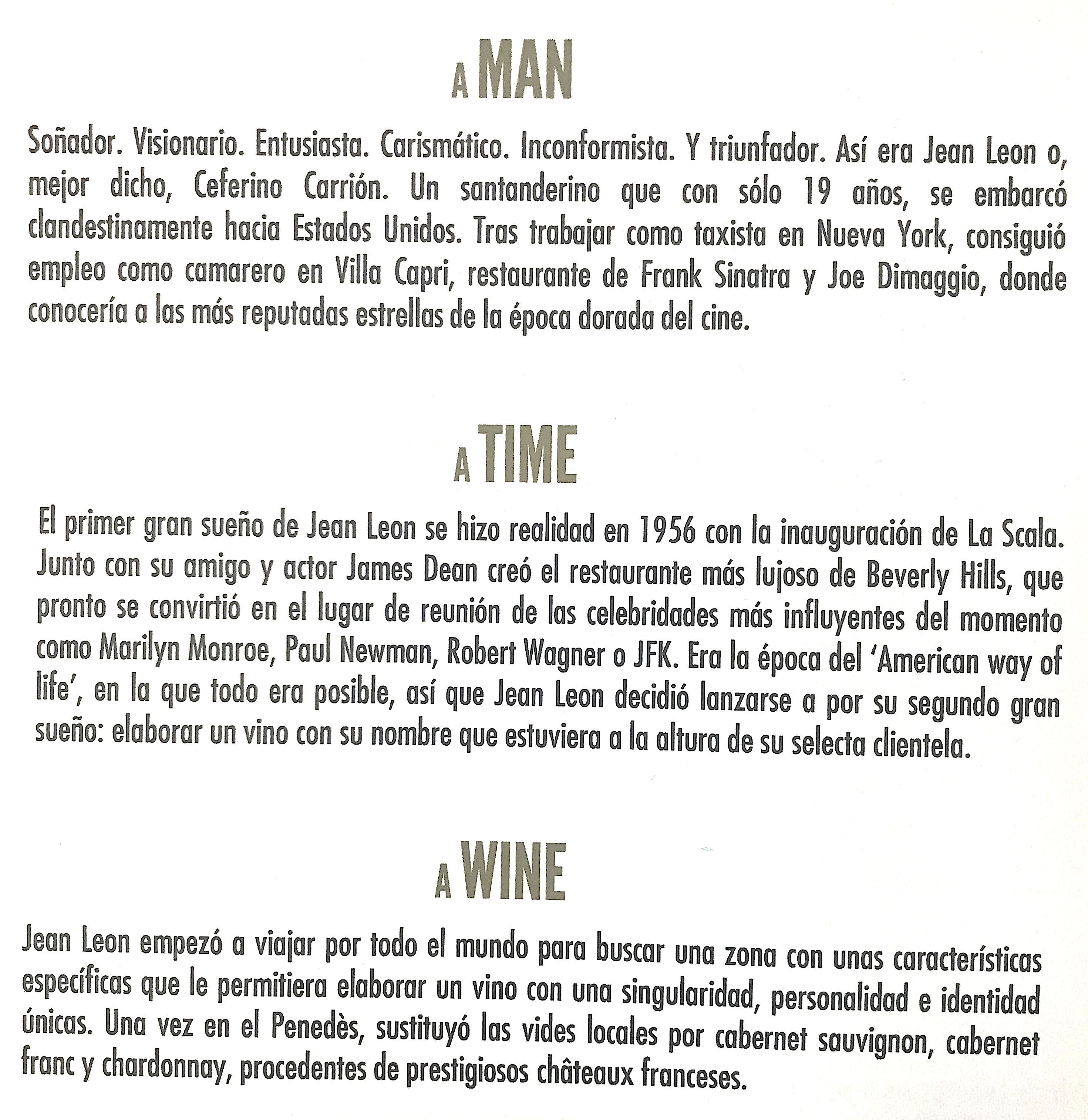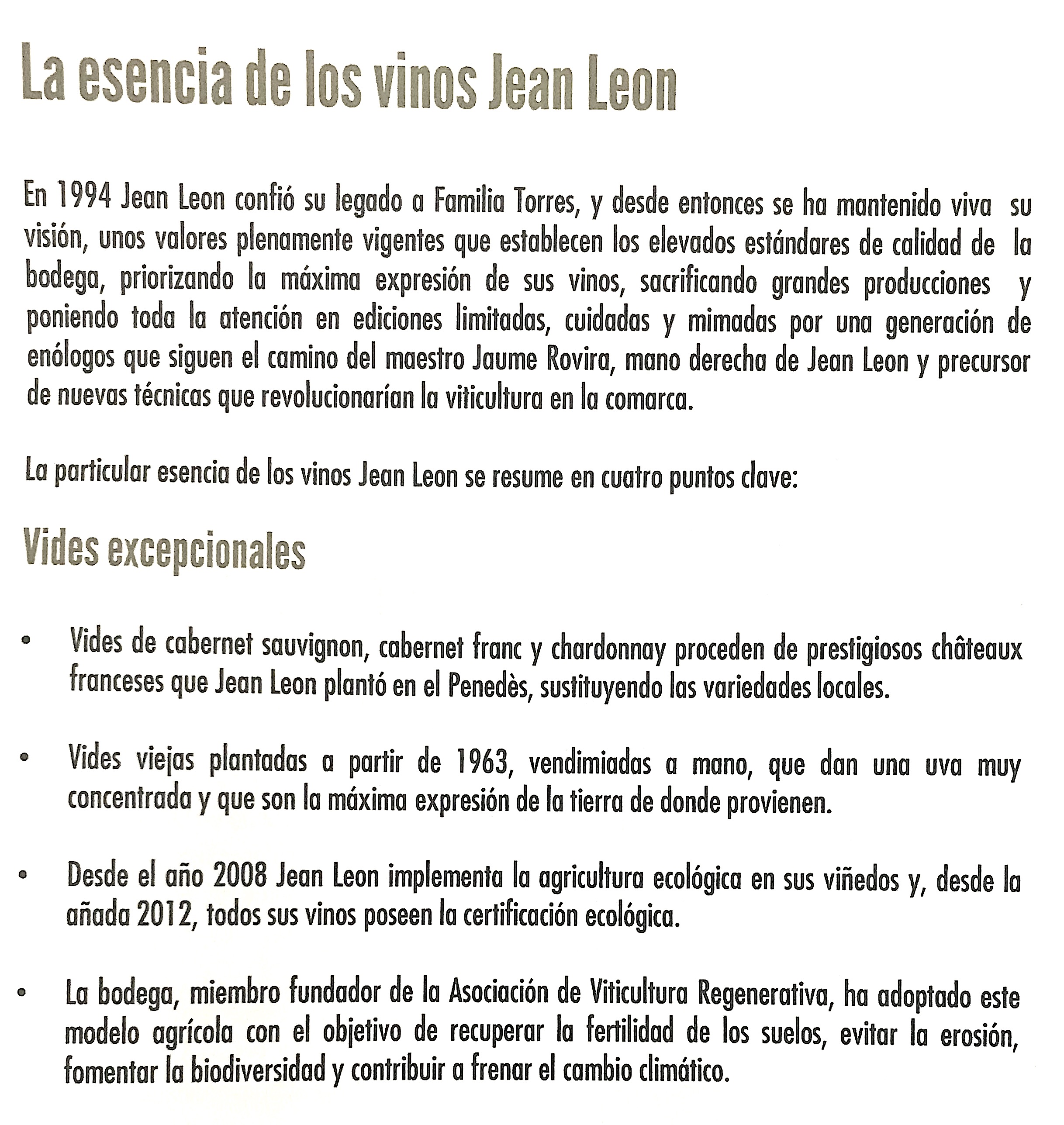 El proyecto es clave y se sostuvo con la visión "abroad" proyectada por el gran Jean Leon y sus amigos, los que de la mano lo llevaron a lo más alto de la vid. Por ello es necesario seguir la tradición y convertir la uva en el clasicismo de siempre, sin dejar de pensar que los nuevos tiempos traerán nuevos vinos, novedades en las etiquetas modernas y países enriquecedores en la expotación ad hoc, eso si, sin olvidar el pasado nunca como nos deja claro su generación actual.