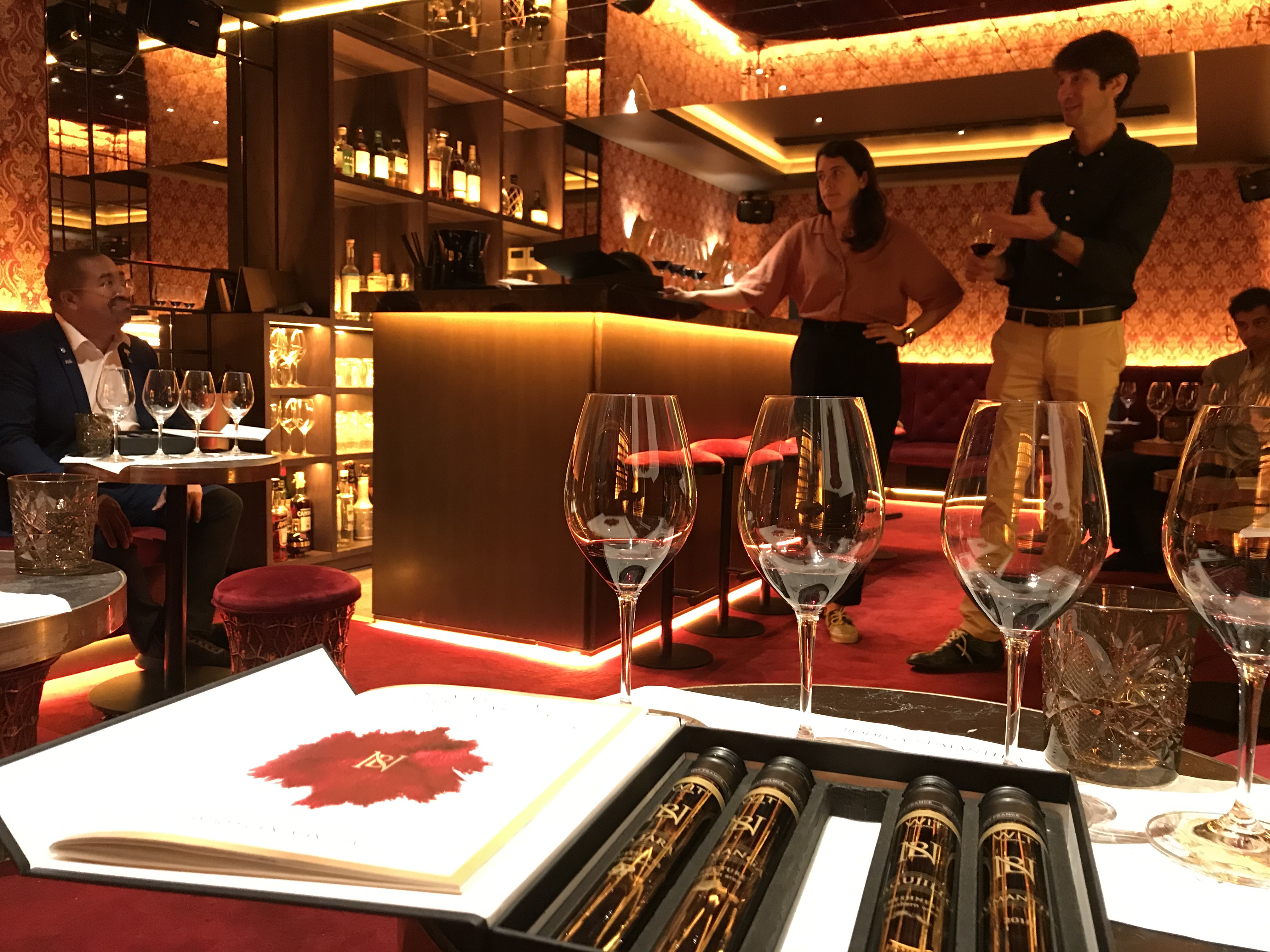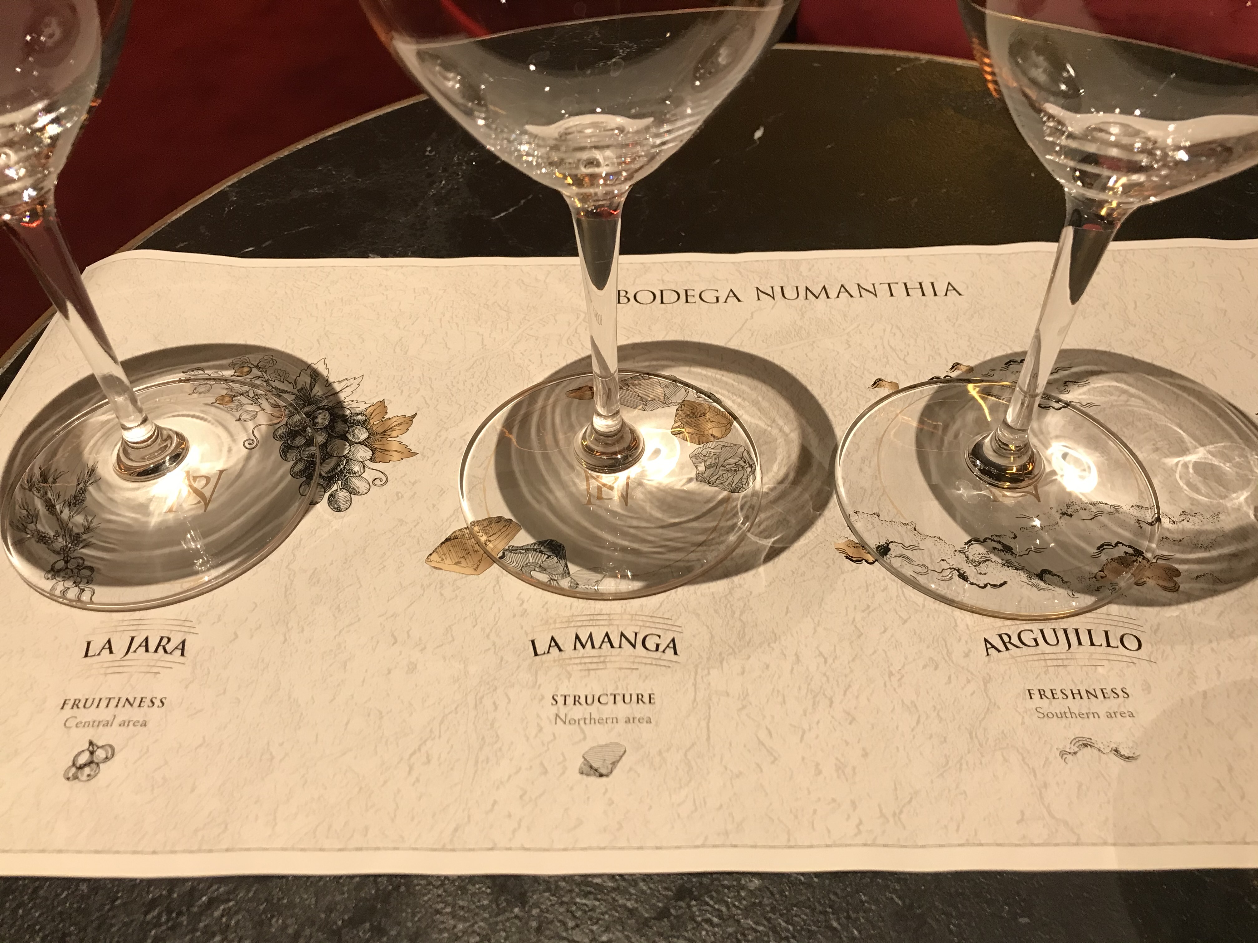 El packaging que la bodega nos entrega, denota auténtico LUJO: unos "matraces" de empresa francesa que son rellenados in situ con el vino enviado por la bodega para cada parcelario y para NUmanthia 2018 actual, un dossier sobre la bodega y los vinos, mantel de cata, copas RIEDEL 001, la enóloga y su parte comercial.