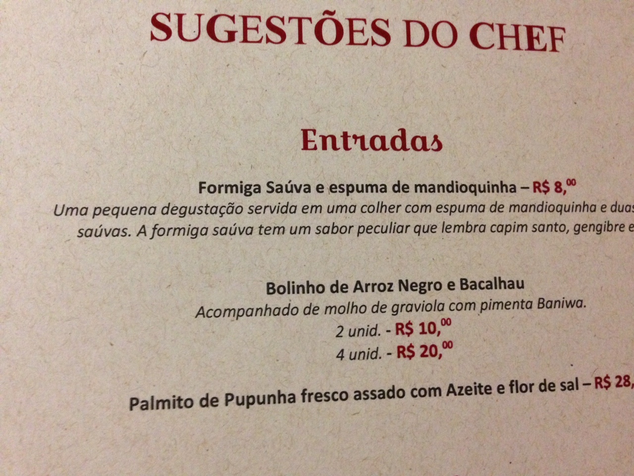 He probado las hormigas Saúva en un conocido restaurante en Manaos, es una de las sugerencias del chef.