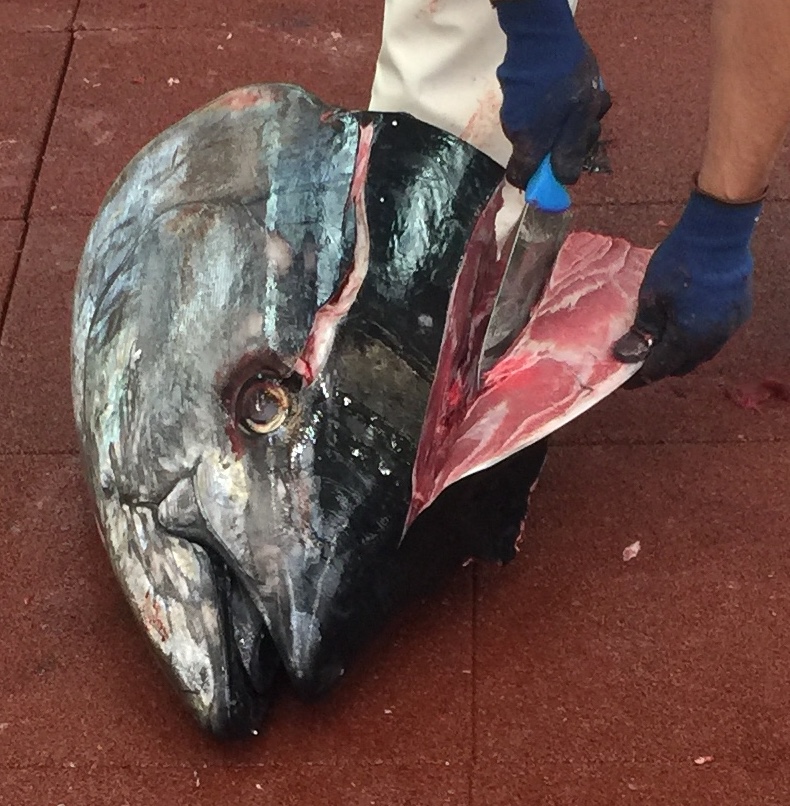 De la cabeza se aprovecha también casi todo. Son piezas muy grasas, lo más valorado es el morrillo (que puede pesar unos 300g en un atun de 200kg).