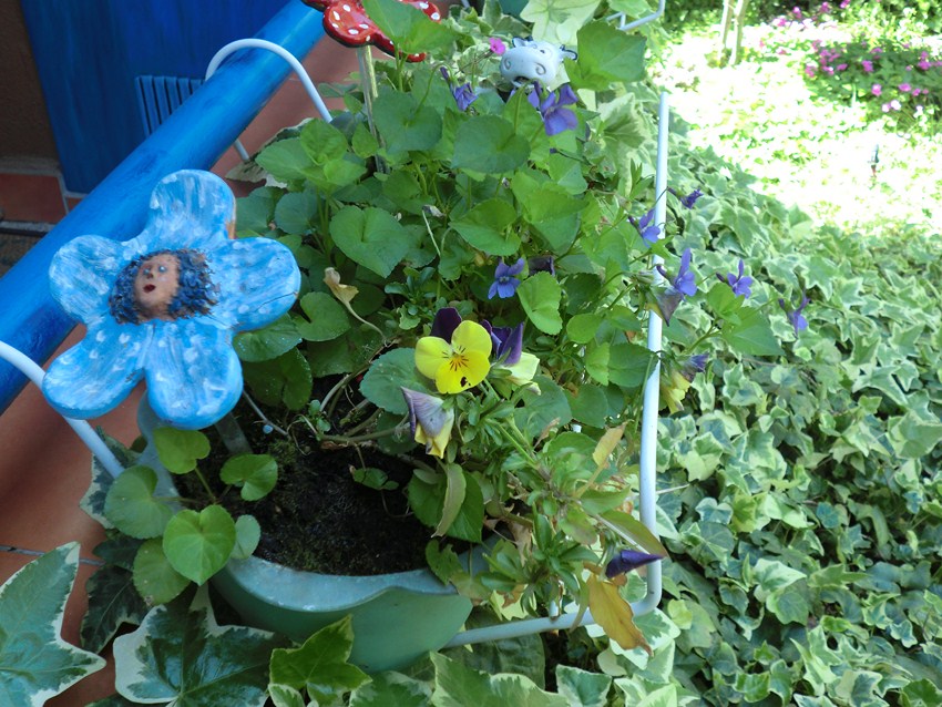 En su recóndito jardín en un barrio tranquilo de Madrid, conviven plantas naturales con esculturas de todo tipo: Flores con carita que te sonríen y una seta gigante que anteriormente estuvo con otras muchas en los exteriores de la Expo de Sevilla, iluminando en la noche los paseos.