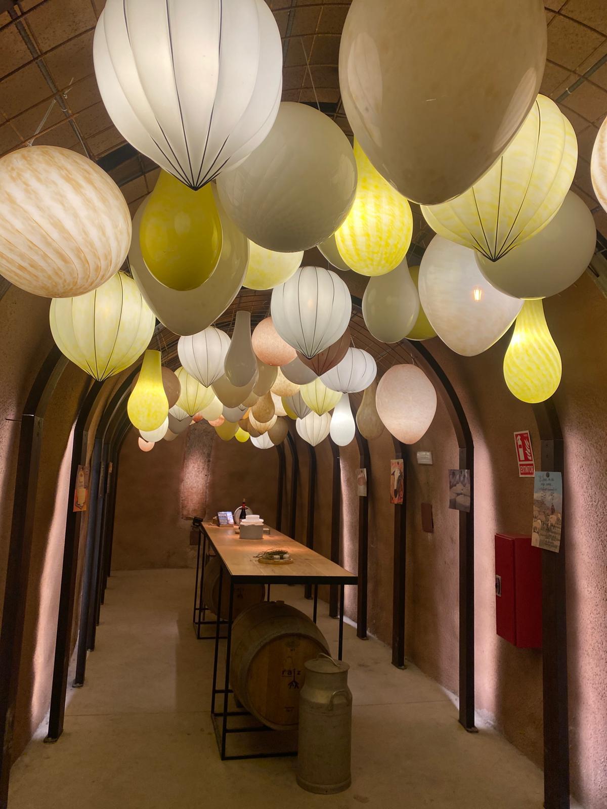 Como podréis observar en la imagen , sorprende esta primera estancia con estas originales lámparas de cristal de Murano, elaboradas a mano especialmente para la bodega, que iremos viendo en diferentes colores a lo largo del recorrido. Un lugar perfecto para disfrutar de los quesos que elaboran con la oveja de raza Churra, que envejecen aquí durante más de un año. Acompañado con el primer vino tinto, Raíz Voy Olé**.