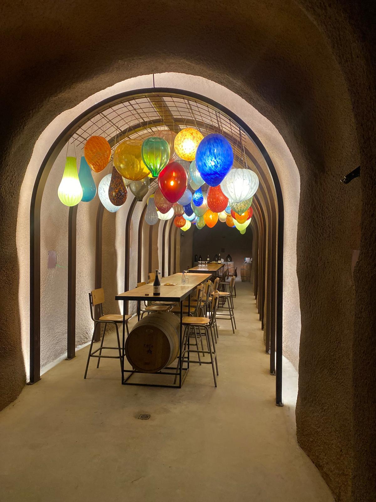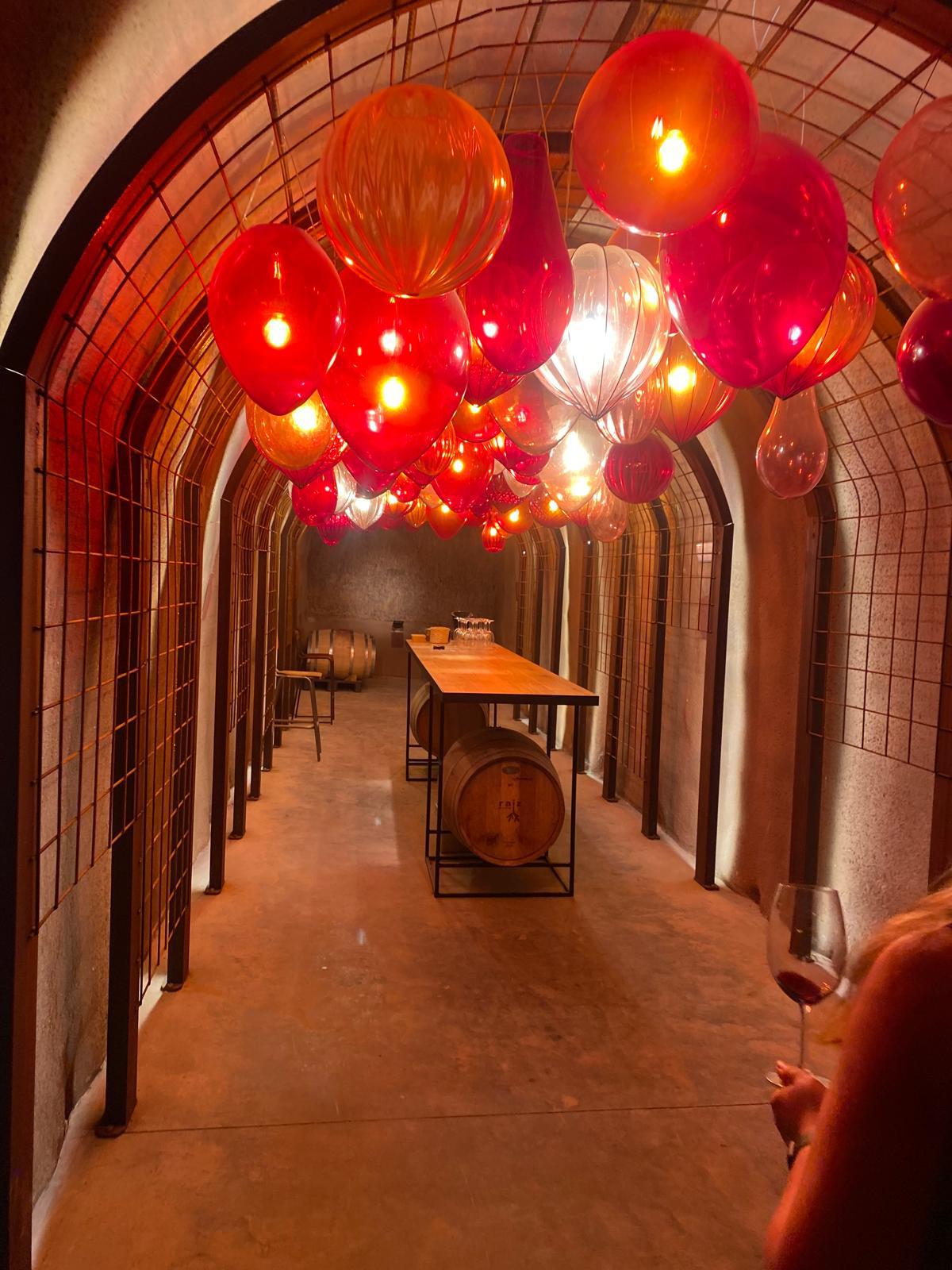 Y seguimos recorriendo las profundas raíces… Aquí catamos sus vinos directamente desde las barricas. El mismo vino con distintos tipos de roble que nos permiten apreciar los matices del tipo de madera donde envejecen. En este espacio ambientado con las mismas tonalidades del vino resaltan las originales lámparas con una amplia gama de colores que van desde el suave rosado al potente granate.