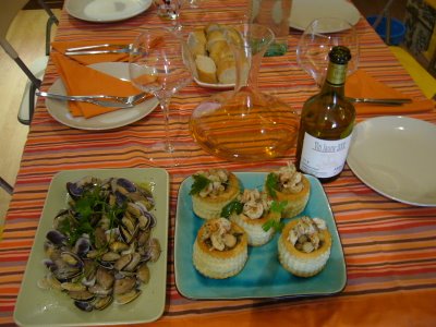 En esta ocasión nos vimos reforzados con la presencia de Enrique, compañero de mi antiguo grupo de cata (El Sarmiento). Siendo cinco integrantes decidimos elaborar un menú de cinco platos mas un postre acompañados por sus respectivos vinos, seis por tanto en total. Cuando los productos del mar salen a escena lo mejor es intentar respetar su calidad, frescura y características con elaboraciones poco agresivas y que intenten resaltar al máximo sus cualidades naturales. Y como veremos más adelante es lo que tratamos de conseguir. Y como siempre, a pesar del menor protagonismo de la elaboración, nuestra cocinera Mercedes volvió a mostrarnos su pericia con los puntos y las cocciones de los diferentes productos.