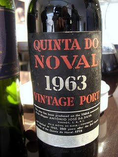 Con el postre, un goloso brownie de chocolate con helado de vainilla, llegó el vino más esperado de la velada, al fin y al cabo la principal razón por la que montamos este “sarao”, un Quinta do Noval Vintage 1963. Claro, hablamos del más grande de los productores de Oporto y de una de las añadas más importantes del Siglo XX. El aspecto de la botella es inmejorable y el corcho sí que parece algo deteriorado. Lo bonito de estos vinos es utilizar unas tenazas de degollar, pero es evidente que no disponemos de tal utensilio, así que primeramente nos decidimos por el sacacorchos de varillas. Tras un primer intento no lo tenemos muy claro por la fragilidad del corcho, así que finalmente decidimos utilizar el tradicional. Como es habitual en vinos viejos el corcho queda hecho fosfatina, pero decantando con un filtro evitamos la caída de restos de corcho y por supuesto de los abundantes posos que aparecen en los vintages con años, no olvidemos que no están filtrados previo embotellado.