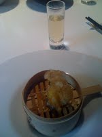 El Dim sum al estilo David Muñoz. Plato de cuidada presentación, que se comía en dos fases y con la mano. Espectacular la explosión de sabores, al igual que la perfecta textura de la puntilla, crujiente y explosiva. La oreja, melosa y sabrosa, magníficamente tratada. Se acompañaba con un té verde japonés, como manda la más pura tradición oriental. Nos gustó más, eso sí, con el champagne.