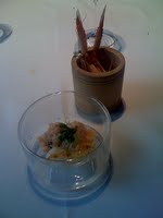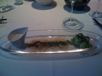 De una carta de vinos correcta aunque poco arriesgada, elegimos tres botellas, un champagne Marc Hebrart Spécial Club 2004, un Nikolaihof Grünner Veltliner Federspiel 2007 y un Marcel Deiss Bergheim Pinot Gris 2002, amén de media botella de Tío Pepe con los aperitivos.