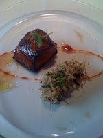 Curioso este pescado que procede de Canadá, no muy sabroso per se, pero con una delicada y mantecosa textura que da mucho juego en cocina. El plato es una reinterpretación del cerdo al estilo mongolés, donde lo más importante es la propia preparación del pescado. Nos gustó mucho el invento, aunque no es un plato fácil de comprender.