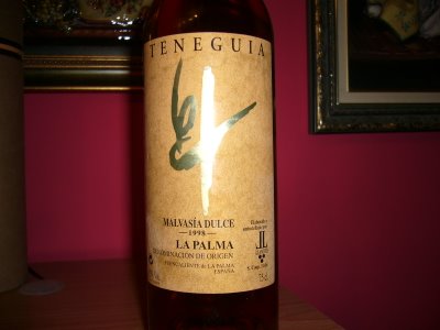 Acompañamos con un curioso vino, uno de los más personales vinos dulces que podemos encontrar en España, una malvasía de La Palma. Este es un vino elaborado con uvas de vendimias tardías y que resulta muy curioso por sus notas de fruta escarchada y mieles en nariz y por su untuosidad y dulzor en boca que afortunadamente no llega a empalagar y resulta muy agradable.