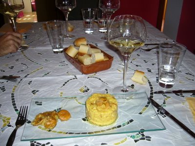 El risotto recordemos no es más que un arroz meloso ligado con parmesano y mantequilla. Y lo cierto es que Mercedes lo borda con varias versiones antológicas (al azafrán con boletus, de langostinos y senderuelas, etc). Esta vez y para estar a tono con el menú llevó chantarellas o rebozuelos, al fin y al cabo la misma seta con diferente nombre. Se trata de una seta muy sabrosa, gelatinosa, de una carne ligeramente amarillenta y que combina perfectamente con el risotto. Para ligarlo un "Parmigiano reggiano" de 36 meses y como materia prima uno de nuestros grandes arroces: el "bomba" de Calasparra. Un plato realmente excepcional presentado en pequeños timbales. Con un arroz tan cremoso y sabroso, nada mejor que un blanco con carácter, con fuerza, elegancia y madurez.