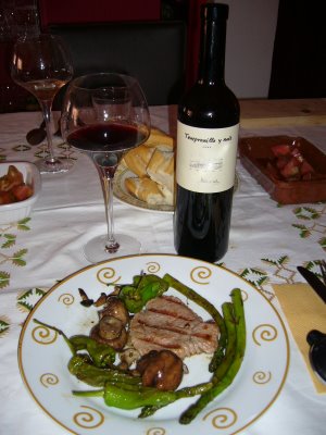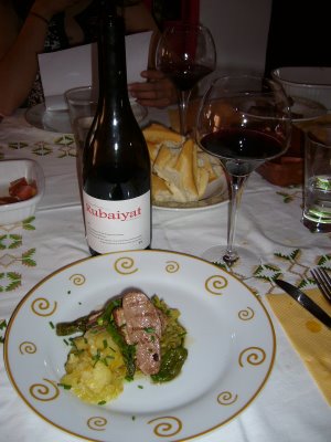 Como último plato avícola elegimos un siempre sabroso y contundente magret de pato asado en la sartén en sus propios jugos, preparado con una buena profusión de verduras (judías verdes en tiras y puerro) que resultaron un perfecto contrapunto. Unas patatas panadera sirvieron además como guarnición.Con el magret servimos el último vino de Barranco Oscuro bautizado con un curioso nombre, “presenta Rubaiyat 2005”. Se trata de un vino varietal de Syrah que en sus inicios se muestra algo reducido pero que con el aire va abriendo en una gama aromática muy elegante y expresiva, siendo un vino bastante redondo y francamente disfrutable, que acompaña perfectamente al magret. Nos pareció un vino más hecho en estos momentos que el tempranillo anterior y una syrah muy bien lograda, de tintes que poseen una mayor similitud con vinos más norteños que con otros de similares latitudes. Un buen trabajo sin duda.