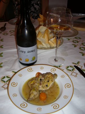 La codorniz escabechada es siempre otro plato de nuestro gusto, sencillo de preparar, sabroso y muy socorrido, aunque si se quiere disfrutar bien hay que trabajarse bien a las volátiles, por lo que no es un bocado para llevar prisas. Estas en concreto salieron perfectas de punto de cocción y con la incidencia justa del vinagre. Muy ricas.Acompañar un plato de escabeche con un vino siempre resulta complicado. Una opción siempre segura es un fino y manzanilla bien hecho o en su defecto un blanco seco con algo de madera en su elaboración, así que probamos con este curioso blanco elaborado con tres variedades que comienzan por V, como son Vijiriega, Vermentino y Viognier. Ya el color nos dice algo diferente, que confirmamos con la cata. Se trata de un vino tremendamente peculiar, un tanto oxidativo, de gran peso en boca, algo falto de acidez, pero ante todo muy sabroso. Requiere de aire para expresarse mejor en nariz. Uno de los vinos nacionales más originales que he probado últimamente. Ojo, hay que decir que no es un vino fácil, que es algo peculiar y muy personal. A nosotros nos gustó a los cuatro.