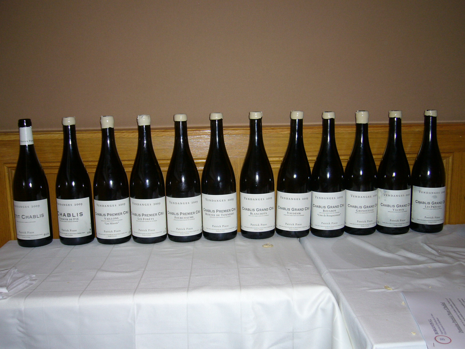 La cata consistió en doce vinos de la añada 2009, segunda del productor y una añada de carácter más cálido y maduro que sus antecesoras. Se comenzó por el Petit Chablis, seguido del “village” Terroir de Fyé, cuatro de sus seis premier cru y seis de sus siete grand cru.
