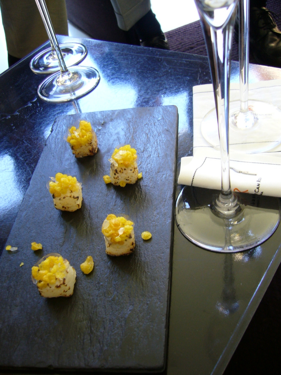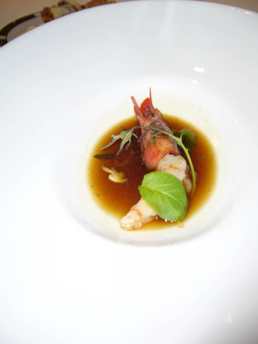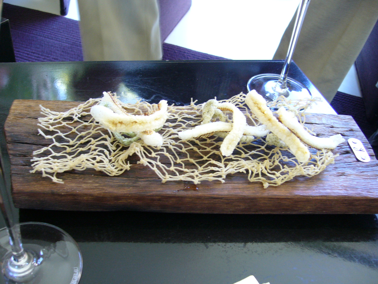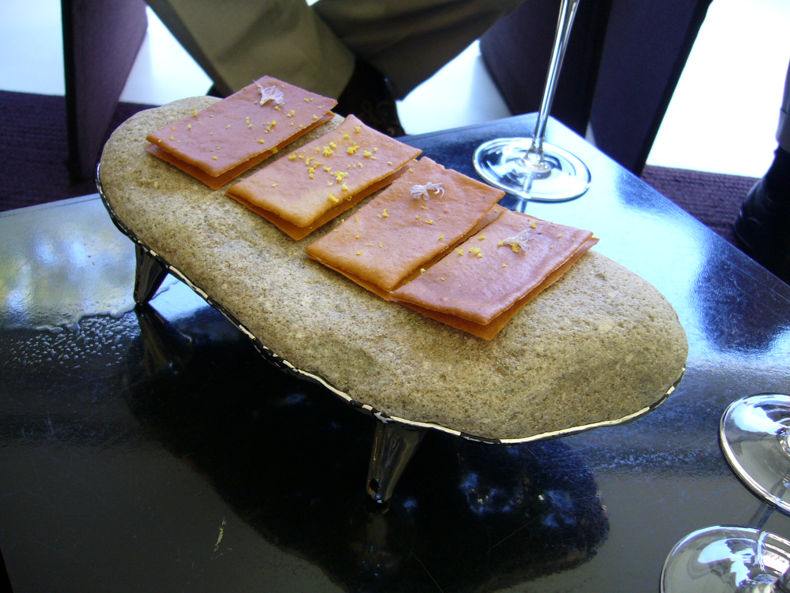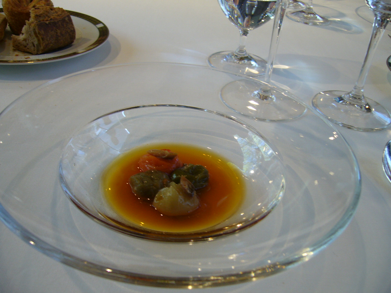 Nos ofrecen para comenzar un cava, en concreto un Alta Alella Privat Nu 2008. Este no es un cava cualquiera, se trata del primer cava elaborado sin adición de sulfuroso, algo realmente arriesgado en un vino de este tipo. Elaborado con uva Pansa Blanca (la sinonimia del Xarel-lo en Alella) sin adición de licor de expedición y recientemente degollado, se trata de un cava fresco, delineado, rico, de fina acidez y burbuja perfectamente integrada, un vino tan rico que…nos bebimos tres botellas en dicho aperitivo. Los aperitivos consistieron en un divertido juego de sabores, contrates y texturas y no hacían otra cosa que preparar nuestro paladar y nuestro intelecto para el auténtico festín sensitivo que se nos iba a venir encima. Llegan a la mesa dos olivos-bonsáis con una serie de aceitunitas en cada uno de ellos. ¡Para comer! Dos cada uno, de forma religiosa. Son un juego de esferificaciones caramelizadas rellenas de de una esencia de anchoas con una textura delicada y sedosa, que se deshace en la boca dejando un liviano sabor a anchoa. Después nos ofrecen unos bombones de Campari explosivos, que juegan con diferentes sabores tras su eclosión y que demuestran que el clásico bitter italiano de toda la vida es algo que puede darnos mucho juego por su inigualable punto de amargor. Que pase el siguiente juego: unas tejas de pollo a l’ast crujientes y apetitosas como ellas solas, que transmiten ese añorado sabor de del pollo asado de los domingos y fiestas de guardar, con ese puntito de cítricos que tanto nos gusta. Sabores de antaño en un formato muy actual. Algo menos satisfactorias pero igualmente originales, resultaron las espinas de anchoa con témpura de arroz de Pals, que se acompañaban por un alga preparada de la misma manera. De nuevo el juego de texturas crujientes y sabrosas, aunque fue lo que menos nos convenció del tercio, tercio que terminamos con una curiosísima forma de preparar una ensaladilla rusa, en pequeños cubículos individuales y que aportaban un toque futurista a un bocado tan tradicional como delicioso. Así pues, con esta fantástica propuesta inicial de juegos de diferentes tramas acompañados por este no menos fantástico cava, completamos un divertidísimo aperitivo que no hacía más que irnos preparando para la que se nos venía encima.