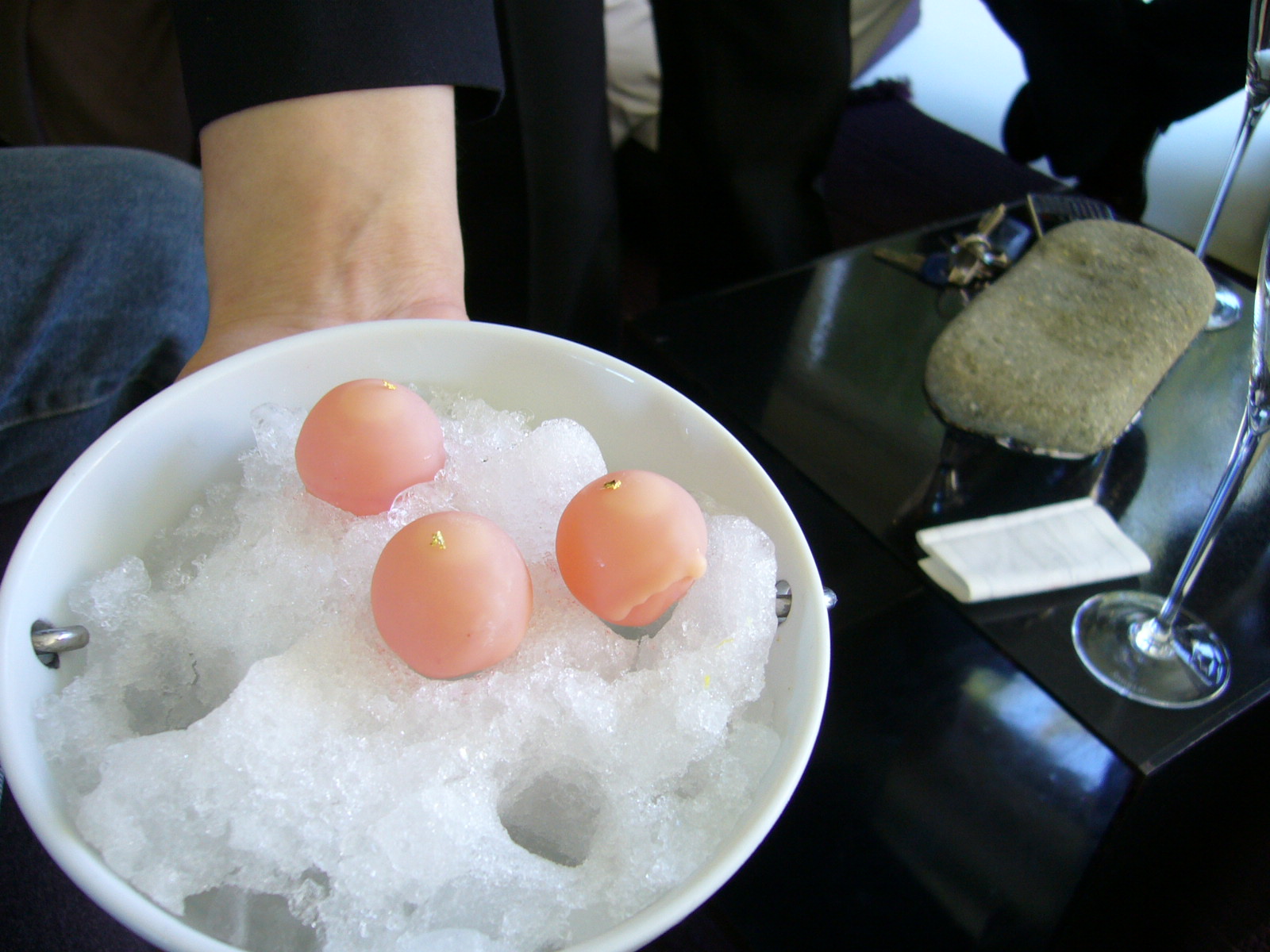 Ya eran algo más de las 7 de la tarde, nos levantamos y nos pusimos a comentar nuestras impresiones con los tres hermanos, gente con la que da gusto hablar porque no han perdido ni su humildad ni su capacidad de escuchar al cliente, pese a que nadie puede dudar de su enorme talento que ha situado a su restaurante en la cima mundial. Volvimos a la sala de sobremesa y nos tomamos el café (muy bueno, aunque no excepcional) y la copa de rigor, la mayoría eligió el Gin Tonic (Gin Nº209) y nosotros fuimos una vez más fieles a nuestro malta, en este caso un Ardbeg Ten Islay single malt, whisky básico de una casa que cada vez nos gusta más. Además teníamos sobre la mesa dos cajas con los petit-foirs, que consistían en un praliné dorado de avellanas, un palet d’or, una esfera de yuzu, un “mont-blanc” y una frambuesa. Ricos y originales, aunque en este tercio, la caja del Bulli es inigualable. En fin, que trago a trago, sorbo a sorbo, nos dieron las 9 y media de la noche y tuvimos que abandonar el local pues la cocina ya estaba a pleno rendimiento para la cena y había que dejar libre la sala por si alguien deseaba tomar el aperitivo en ella. Siempre cuesta dejar un lugar donde está tan a gusto, pero no quedaba más remedio y lo hicimos con la mejor de nuestras sonrisas en la boca.