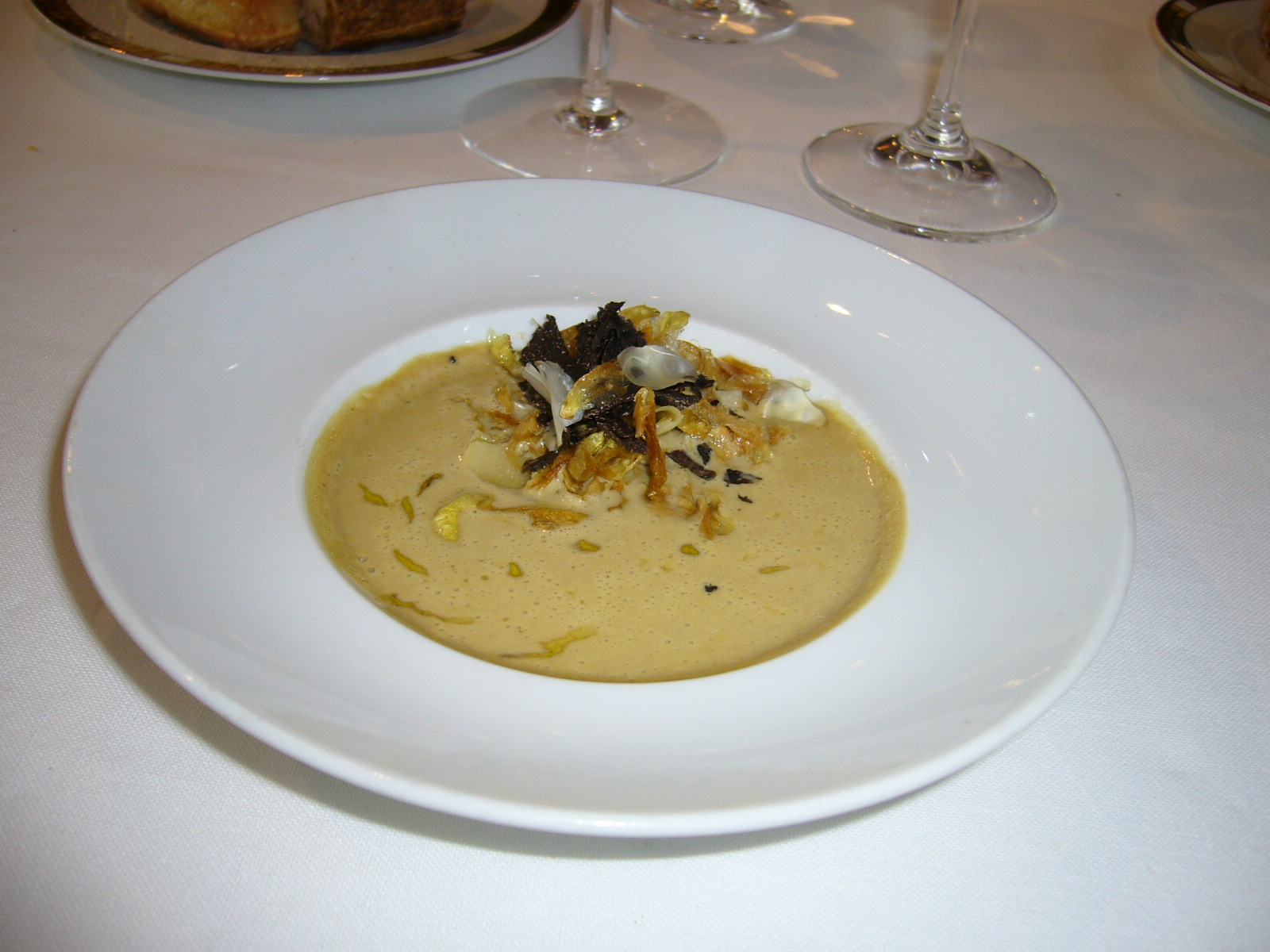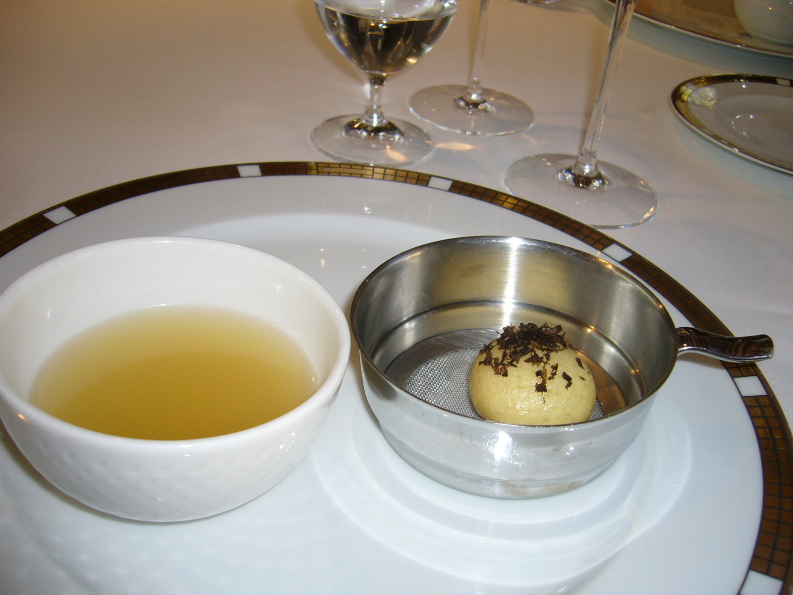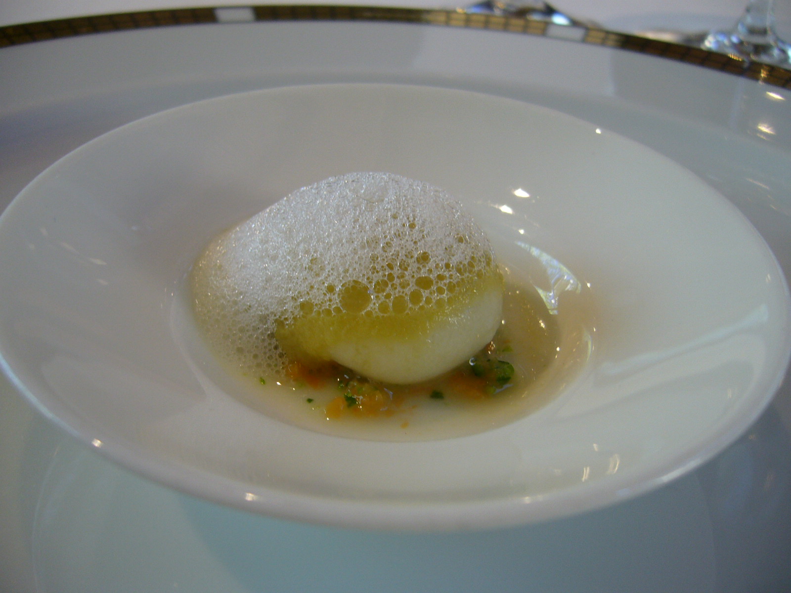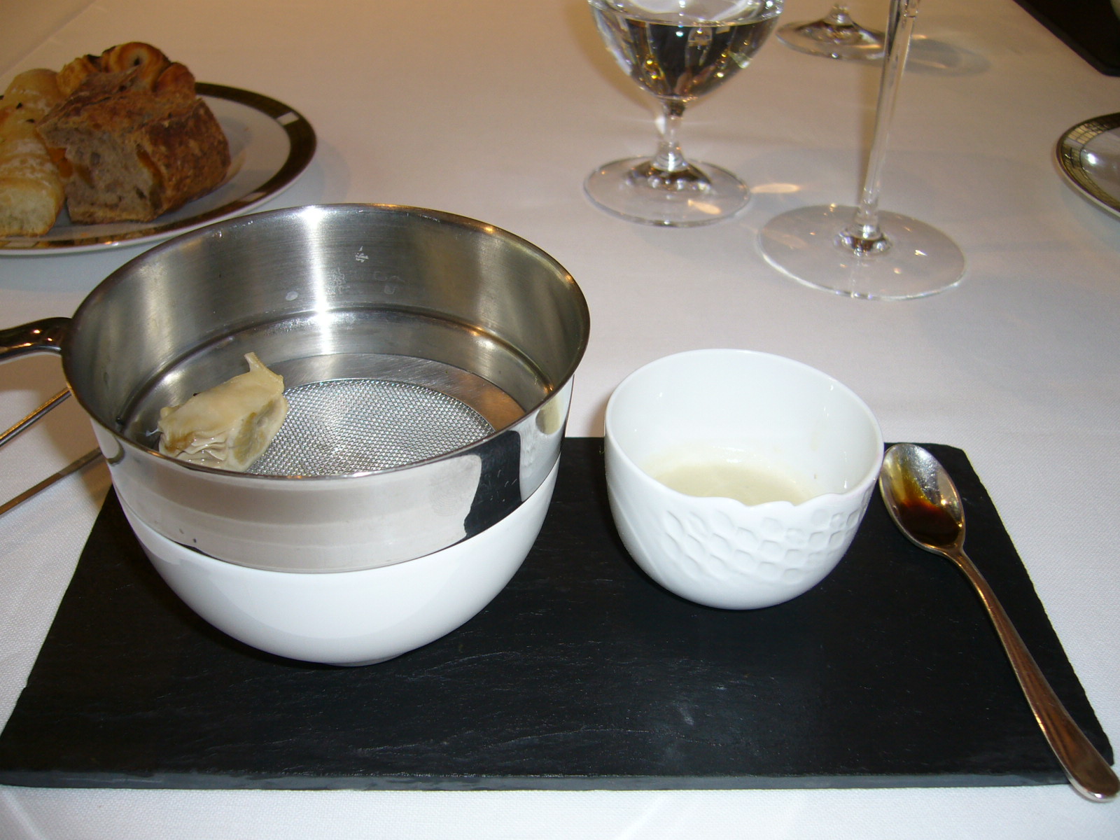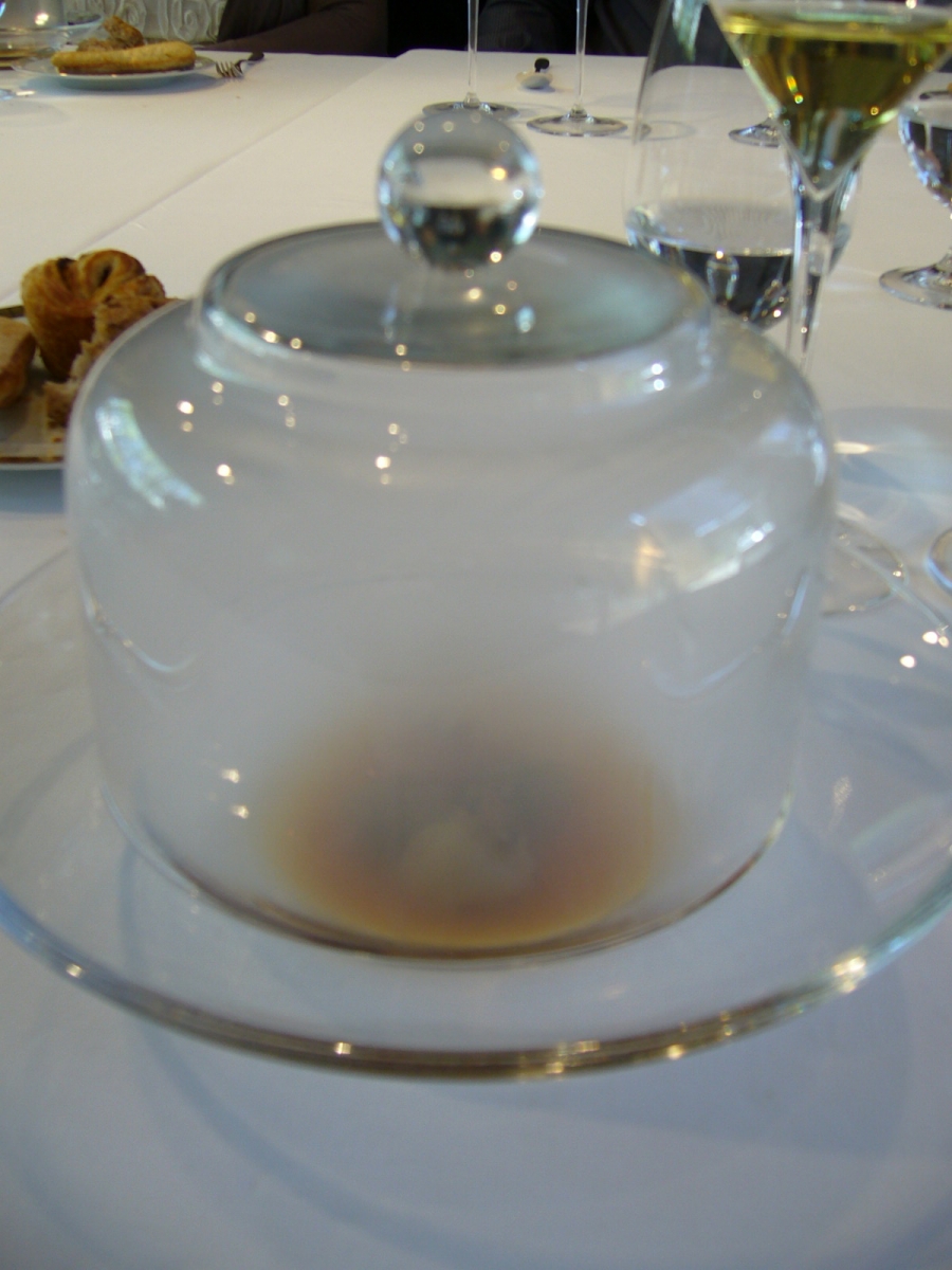 Llegan a la mesa unas campanas de cristal con un humo que prácticamente tapa lo que hay dentro de ellas. Cuando las 9 están acomodadas en sus lugares respectivos se levantan y dejan escapar ese humo que perfuma el comedor con los más auténticos aromas de una brasa de encina, que nos hacen cerrar los ojos y nos trasladan a una barbacoa campera. Lo que hay en la base de las campanas es una Escalibada al humo de brasa de encina, formada por tomate, berenjena, cebolla y pimiento en una textura absolutamente sorprendente, se deshacen en la boca dejando el profundo sabor de una verdura de primera y el recuerdo de una brasa, tratada a su máximo nivel. Un plato ancestral que llega a sus más elevadas cotas en manos de Joan Roca y su equipo. El siguiente plato es probablemente el cénit de la jornada, se trata de una Alcachofa con naranja y aceite de trufa, rematada con una trufa negra y una sopa de foie constituyendo la base. Qué quieren que les diga, pero esto es el mismísimo cielo, un bocado sublime en todas sus fases, una explosión sápida, una amalgama de sabores delicados y contundentes perfectamente orquestados con delicadeza y sutilidad, uno de los mejores platos con los que nos hemos topado jamás. La emoción invade la mesa, el silencio, los murmullos de admiración, dan ganas de levantarse, ir a la cocina y estar aplaudiendo a Joan y sus ayudantes hasta que nos duelan las manos. Este plato nos hizo replantarnos nuestras escalas numéricas de valoración. ¿Y si incluimos el 11 sobre 10? Con creaciones como estas, lo cierto es que no nos queda otra que planteárnoslo.