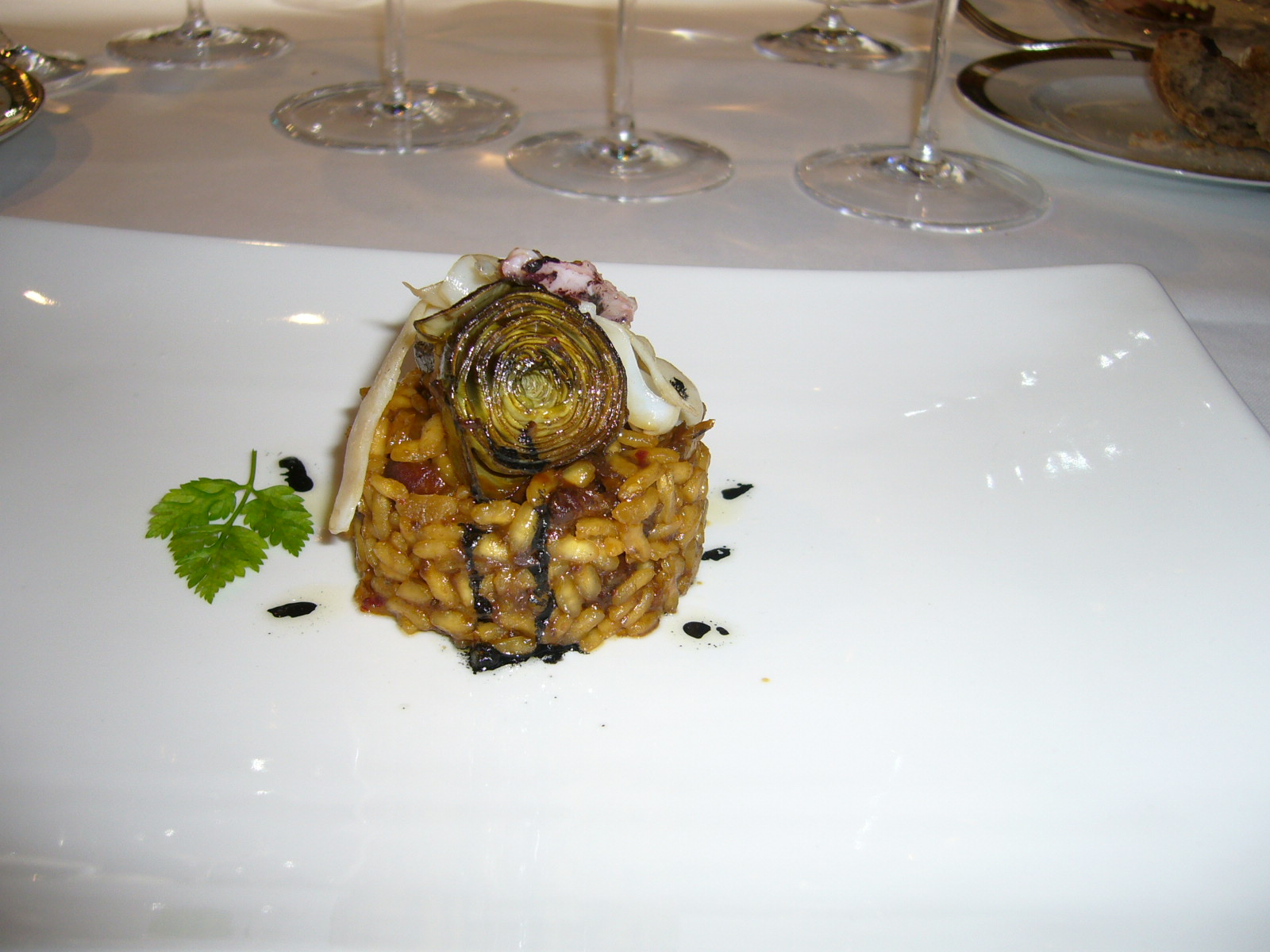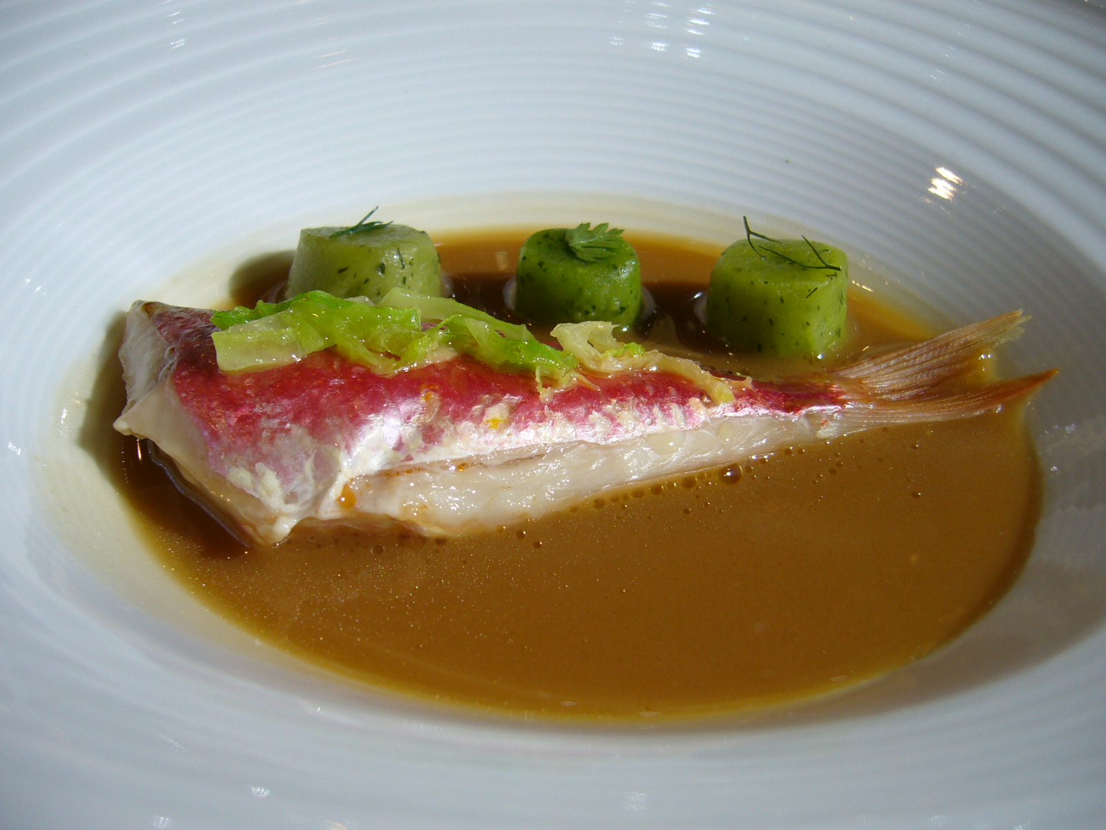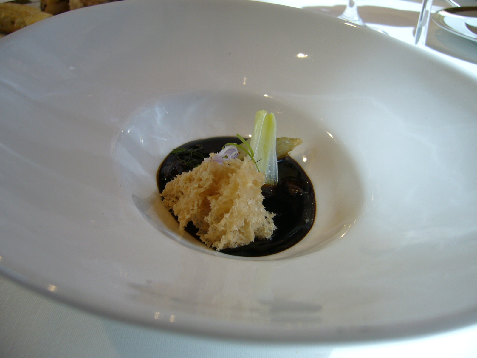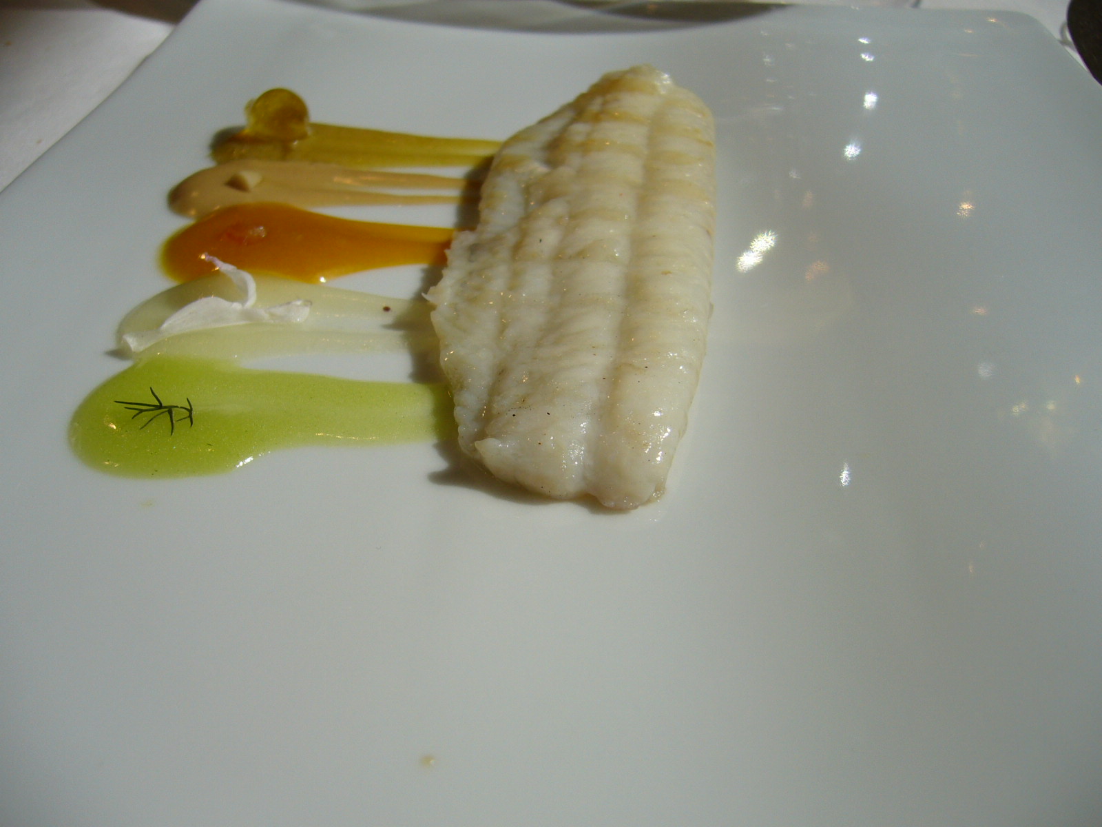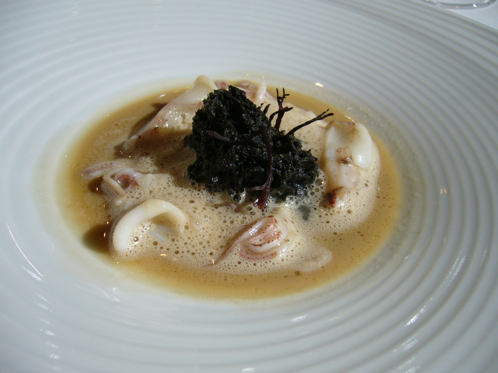 Pasamos al turno del pescado con un Lenguado con aceite de oliva y sabores del Mediterráneo que consiste en dos lomos pegados con su depurada técnica de cocción al vacío y pasados ligeramente por la brasa, acompañados por una serie de aceites perfumados que deben ir untándose en el orden establecido, ya que la intensidad de los sabores es muy diferente. Los aceites son de hinojo, bergamota, naranja, piñones y olivas verdes. Este es un plato ligero, muy Mediterráneo, donde destaca la calidad del pescado y su punto perfectamente obtenido, con ese mínimo sabor que impregna la brasa y que resulta una delicia en la mezcla con los aceites esenciales, ya que resultan un perfecto contrapunto a la suavidad del lenguado. Este plato no provocó la unanimidad general en la admiración como los anteriores, quizá no tenía un punto de sabor tan marcado, pero su delicadeza y originalidad resultaban patentes. Otro plato donde la sutilidad y el juego de texturas volvían a ser protagonistas fueron los Calamares en roca de cebolla, que realmente consistían en unos chipirones cuyo punto de cocción meloso resultaba realmente sublime, acompañados por una roca de cebolla en la base y la propia tinta del calamar. Maravillosos. Terminamos el turno de pescados con los Salmonetes con suquet y manteca, el salmonete está presentado entero y perfectamente desespinado, y el suquet se obtiene ligando entre otras cosas, el hígado del pescado. Se acompañan con unos ñoquis de eneldo que podrían considerarse con un plato por sí mismos, pero que con el salmonete no hacen más que sumar y seguir. Imposible, absolutamente imposible sacar más de este pescado de roca. Un plato que de nuevo cruza los umbrales de la perfección.