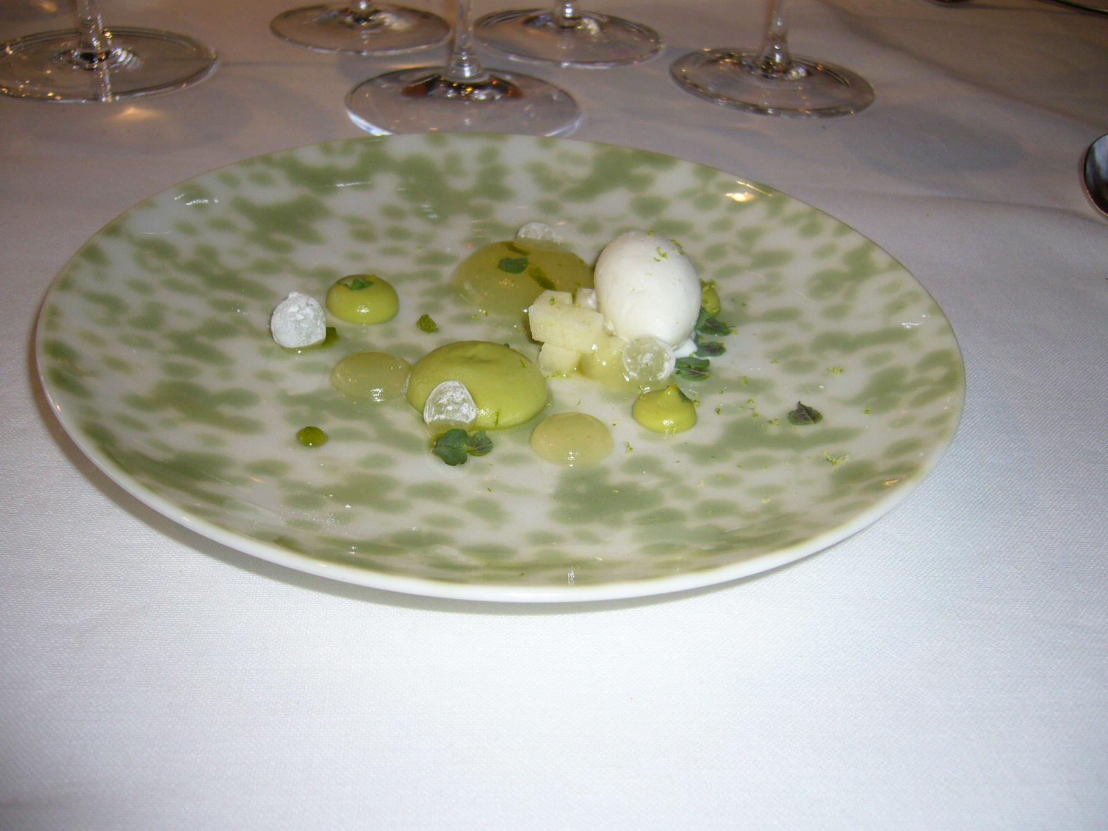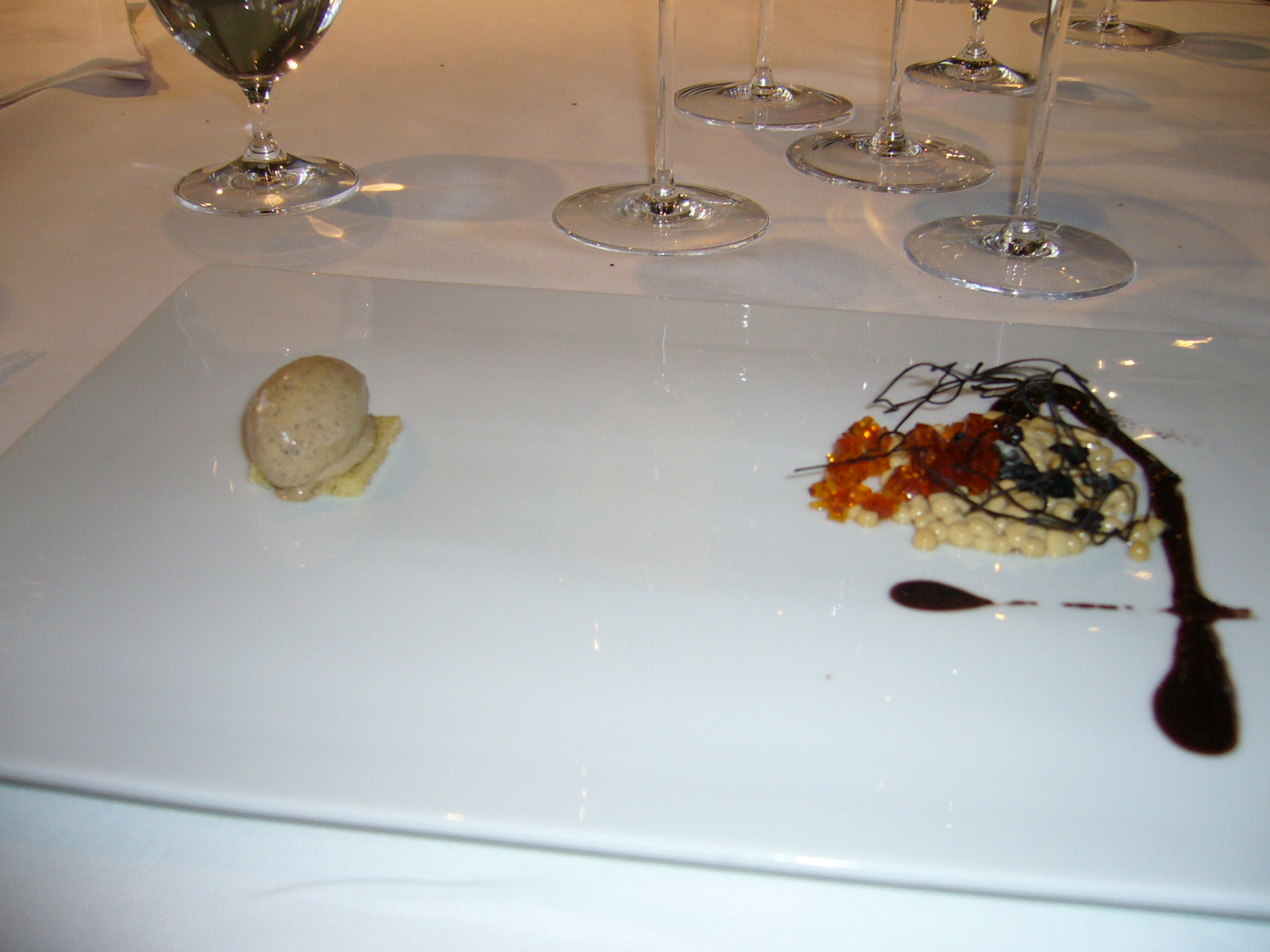 Comenzamos con el Cromatismo verde 2011, un clásico de la casa que esta temporada se compone de helado de eucalipto, shiso verde, chartreuse verde, lima y aguacate. Es el paradigma de los postres de Jordi, juego de sabores balanceando los ácidos, amargos y dulces, diferentes texturas y todo ello con una presentación impactante. Después llegó un Sorbete de naranja sanguina y remolacha, refrescante, personal, de concepción más sencilla pero impecablemente elaborado, para terminar con el impresionante Postre de vainilla, regaliz, caramelo y aceitunas negras garrapiñadas con helado de vainilla de Tahití. Fuera sombrero. Todo está en este postre, una preciosa presentación, múltiples y exóticos sabores con la vainilla como protagonista y un helado que sencillamente te transporta a otro mundo. Pocos postres nos han emocionado, en especial porque muy pocos grandes cocineros luego son grandes reposteros, pero esta creación de Jordi lo consiguió.