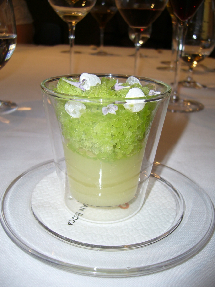 El servicio de los vinos resultó modélico, cada uno en su copa diferente, copas de la máxima calidad, perfectos de temperatura, ni una gota derramada…modélico de verdad. Y escuchar a Pitu Roca, con sus conocimientos enciclopédicos que sabe contar y transmitir como nadie, es un lujo que ningún buen aficionado al vino puede perderse, aunque sea una vez en la vida. En cuanto al servicio de mesas y de sala, es el esperado en todo un tres estrellas Michelín, un personal perfectamente formado, atento, siempre sonriente, servicial sin caer en el servilismo. En fin, un servicio que salvo en un par de detalles sin la mayor importancia brilló siempre a una gran altura.