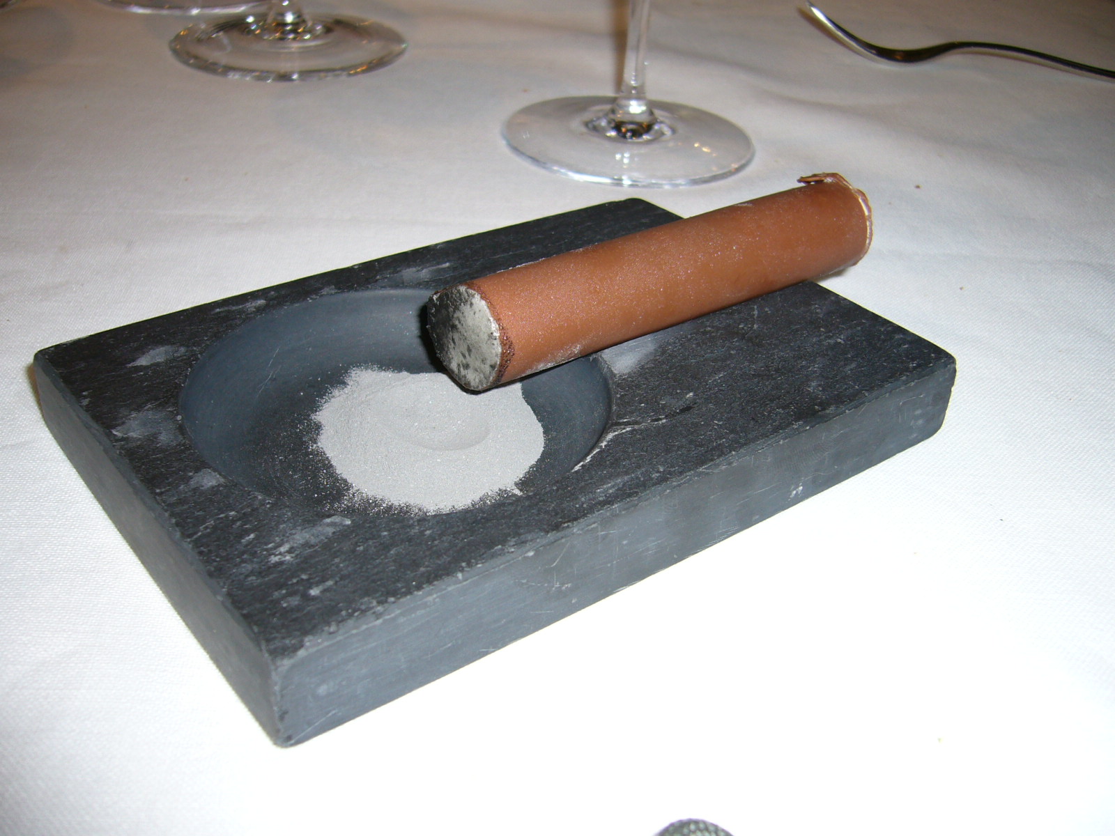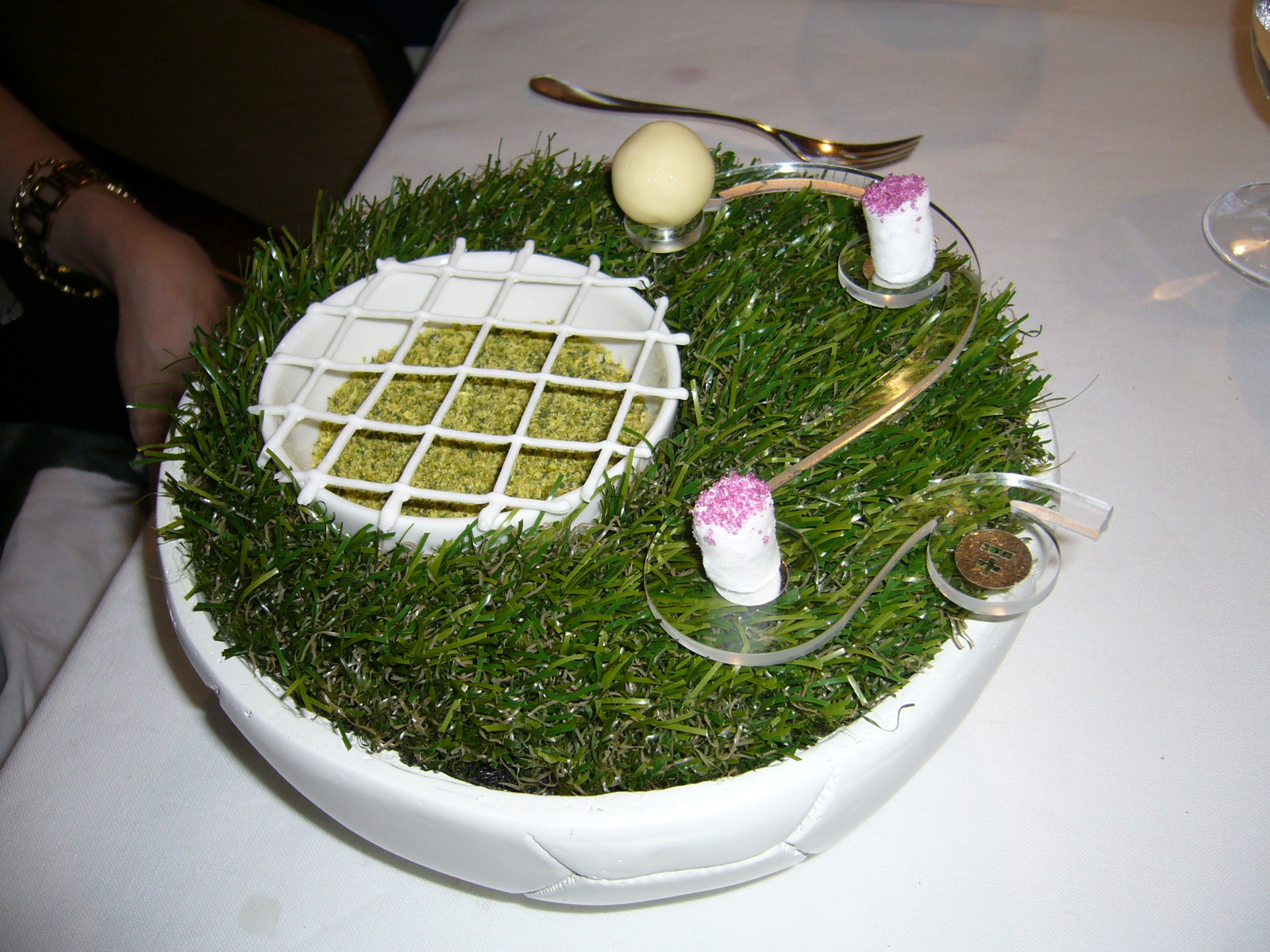 Pero la fiesta no terminó aquí, ya que nos ofrecieron como colofón un clásico y la última creación del genio de los postres, el Viaje a La Habana y el Gol de Messi. El primero consiste en la recreación de un puro de chocolate en un cenicero con su propia ceniza, además de un mojito en diferentes estados. Y el segundo es un juego que consiste en una base que simula un balón con un césped sobre el cual hay tres fases de caramelo y una portería de azúcar, sobre la cual hay que similar un gol virtual mientras se radia una jugada del crack de Rosario que termina en gol. De nuevo y en ambos casos, la audacia, la técnica, la presentación y unas buenas dosis de humor resultan protagonistas en dos postres de bandera. Dada nuestra condición de madridistas confesos éramos un poco reticentes a probar este último, pero al final y para alimentar el cachondeo existente en la mesa en aquel momento no nos negamos a ser participes de él y lo probamos. Muy rica esa portería de azúcar.