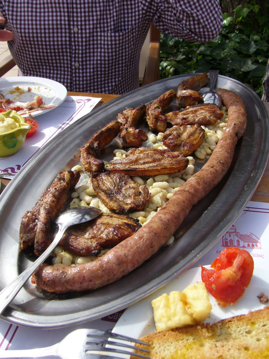 Al día siguiente y dado que el avión de vuelta salía a la hora de comer, nuestro “sherpa aborigen” nos propuso realizar un “desayuno potente”. A escasos 10 minutos del centro de Gerona, en la tranquila localidad de Canet d’ Adri, paramos en un restaurante llamado La Sala que data de 1920. Hace una mañana espléndida y decidimos quedarnos en la terraza, desde la que se divisa la capital en lontananza. Sale un caballero de marcada humanidad (1,90 de estatura y superando los 100 kilos sobradamente) cuyo aspecto era una perfecta mezcla entre Rob Halford (Judas Priest) y Brian Johnson (AC/DC). Con una inquietante seriedad masculla: “ya me encargo yo que todo, ¿qué queréis beber?”. Cuando alguien mentó el café, una coca-cola zero y una cerveza “sin”, su expresión facial era toda una declaración de intenciones. Pedimos una caña y cuando la camarera se acerca con una jarra de medio litro ya comenzábamos a comprender dónde nos habíamos metido. Llegan a la mesa unas enormes rebabadas de pan payés con un tomate y unos dientes de ajo para cada uno. Casi al mismo tiempo aparece una tabla de madera con un cuchillo y más de 1kg de embutidos de la zona en una bandeja (butifarra negra, blanca, fuet, panceta, chorizo). Hale, a darle a la mandolina. Pero esto no es todo amigos, un poco después llega una cazuela de barro con una buena ración de jabalí estofado que estaba buenísimo, perfectamente cocido, se deshacía en la boca. Parece ser que hay mucho jabalí por la zona y lo preparan realmente bien. Más. Un buen plato de bacalao rebozado con compota de membrillo. Y para rematar la faena, una enorme bandeja de butifarra con judías, panceta y costilla de cerdo a la brasa. Ni que decir tiene que cayó otra jarra de medio litro más de cerveza (no nos apetecía vino a esas horas) y que no comimos nada más hasta la cena, cuando ya estábamos en la jungla del asfalto madrileña. Nos encantan estos contrastes, tal y como nos ocurrió con El Bulli y Can Miá. Apenas a 10 minutos del centro de Gerona, nos encontramos en plena naturaleza y realizando un auténtico desayuno payés. Esto es un lujo impagable.