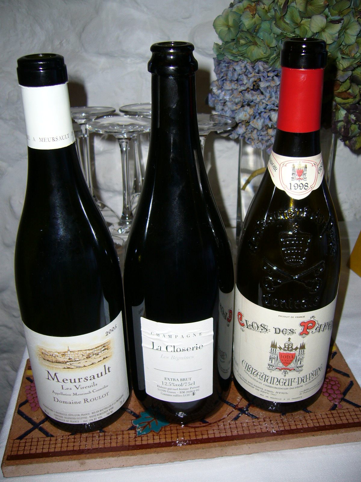 En primer lugar un Champagne La Closerie Les Beguines de Jerome Prevost, una de las mejores expresiones de la pinot meunier que existen y elaborada por uno de los más aventajados discípulos del maestro Anselme Selosse. Vino de bajo dosage, complejo, vínico y mineral, muestra una meunier más austera, con mucha carga de terruño. Champagne de corte oxidativo pero sin pasarse y tremendamente gastronómico, lo cierto es que su armonía con un tataki de bonito resultó excepcional. Uno de esos vinos que todo buen bebedor de Champagne debe probar. Después llegó el turno de un excepcional Domaine Roulot Meursault Les Vireuils 2005. Son ya muchas veces las que hemos señalado a este productor como uno de nuestros preferidos, no solo en Meursault sino en la Borgoña blanca y de todo el mundo. Su estilo austero, mineral, fino y delineado nos encanta y este “lieu-dit” no es más que una muestra de ello, incluso en una añada cálida como 2005, más apropiada a priori para los vinos tintos que para los blancos. El vino es un portento de limpieza y delineación, da gusto beberlo por su equilibrio entre amplitud y longitud. Un grande Roulot. Terminamos con un gran Chateauneuf-du-Pape, en concreto un Clos des Papes 1998. No es ni mucho menos la bodega de Paul Avril nuestra preferida en la zona ya que representa un estilo más moderno e internacional, pero este 98 sí que daba muestras de Chteauneuf clásico con mucho toque animal y un paso por boca ya pulido y manteniendo acidez, con un final noblemente tánico. Una gran añada en la zona y para este vino, aunque es cierto que sufrió ante el nivel del champagne y sobre todo del Roulot, luego nos arrepentimos de no haber cerrado con el Clos de la Barre de Comtes-Lafon en vez de con el tinto, y es que el poder blanco cada vez conquista y nos conquista más, cada vez tenemos más claro que con un gran blanco siempre se sorprende más que con un gran tinto.