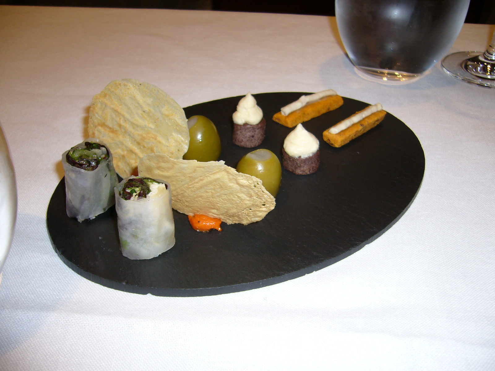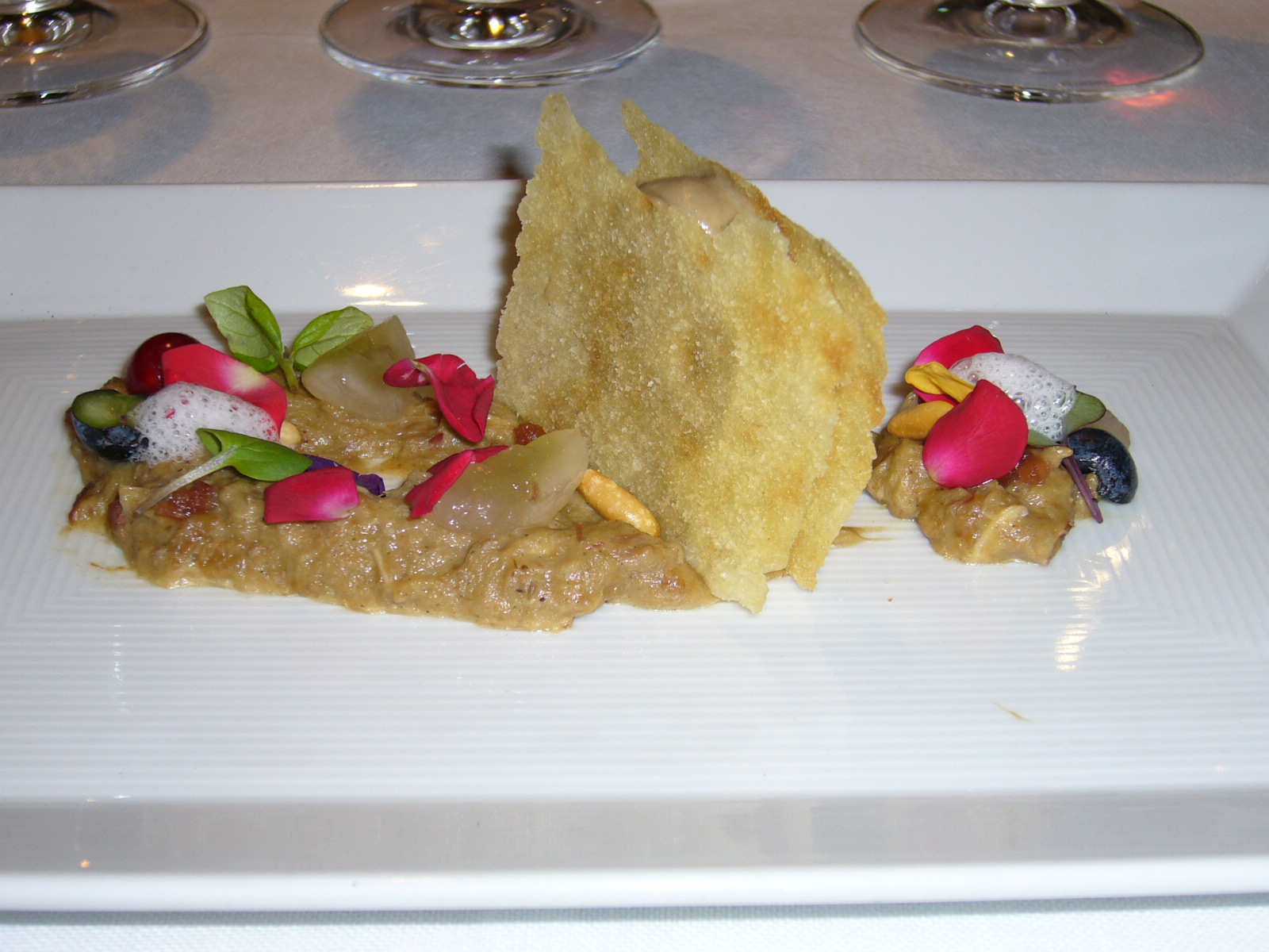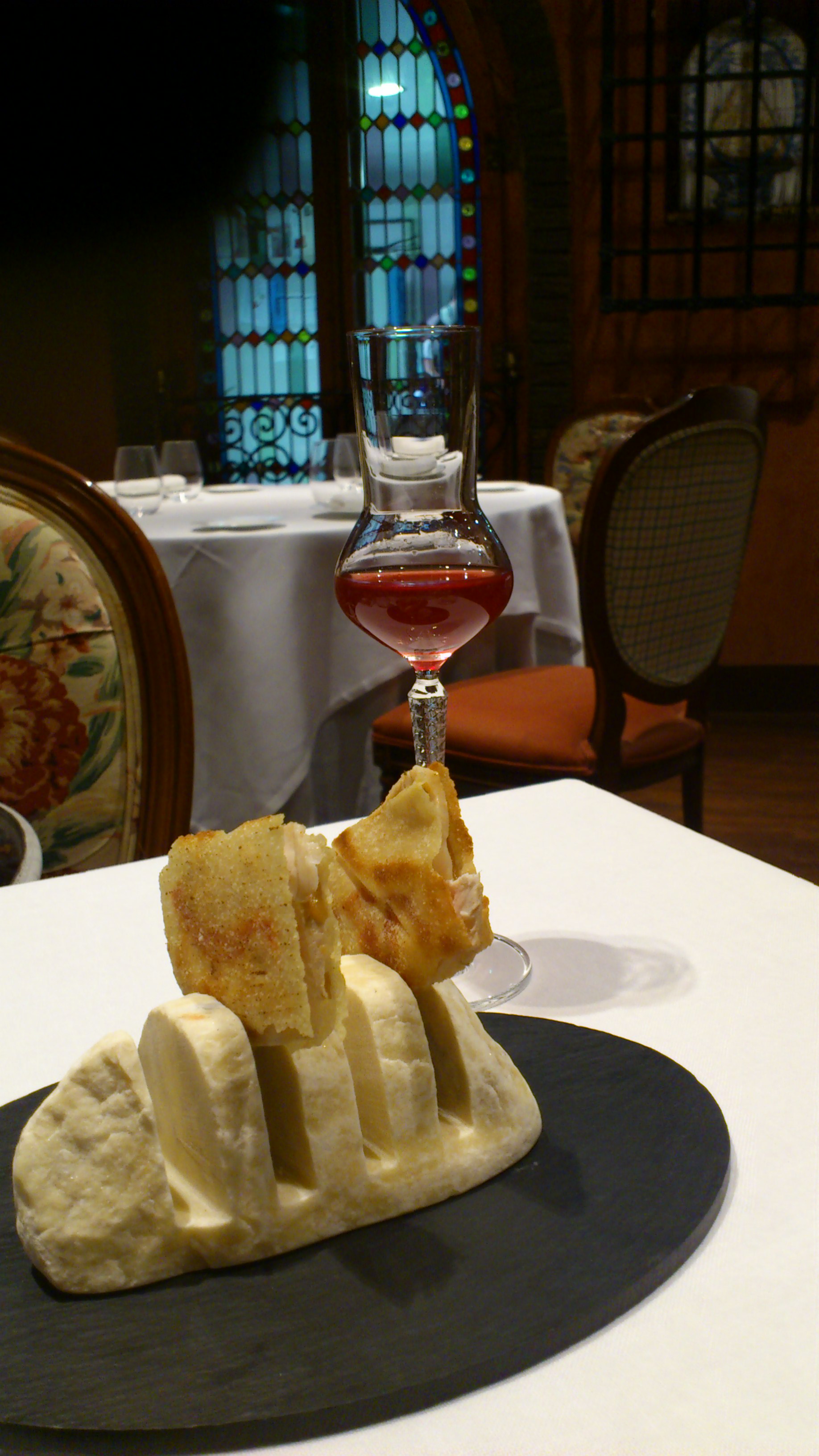 sensorial. Nuestra elección para comer fue el menú degustación, que ya conocemos de otras veces y que nos parece modélico pues muestra con total fidelidad lo que es la cocina de Pepe, esa mezcla perfecta de tradición y modernidad buscando los sabores más auténticamente marcados y respetando como base el tradicional recetario manchego. José Carlos nos ofreció para comenzar la Manzanilla “Navazos” Bota Nº16, saca de enero de 2009. El vino está en un momento excepcional, lo cierto es que tanto esta manzanilla como el fino Macharnudo Alto son vinos que agradecen sobradamente el tiempo en botella y tres años y pico después de la saca se advierte un equilibrio entre las notas punzantes y oxidativas, que hacen de este un vino excepcional capaz de mirar a la cara por calidad pura y dura a lo que vino después. Con la soberbia manzanilla llegaron los aperitivos, la clásica pizarra ovalada con caprichos como el delicioso rollo de cilantro, la galleta de parmesano, la sobrasada con chips de tocino, la galleta de tomate con crema de anchoa y las aceitunas rellenas de lichis. Juegos de sabores atrevidos y chispeantes para despertar los sentidos. Después llega el bocadillo de panceta con sangría, un delicioso bocado de hojaldre con panceta ibérica y acompañado por una fresca sangría para terminar con un nuevo aperitivo basado en un bocadito de hojaldre hueco y que estaba fantástico, aunque no recordamos el nombre.