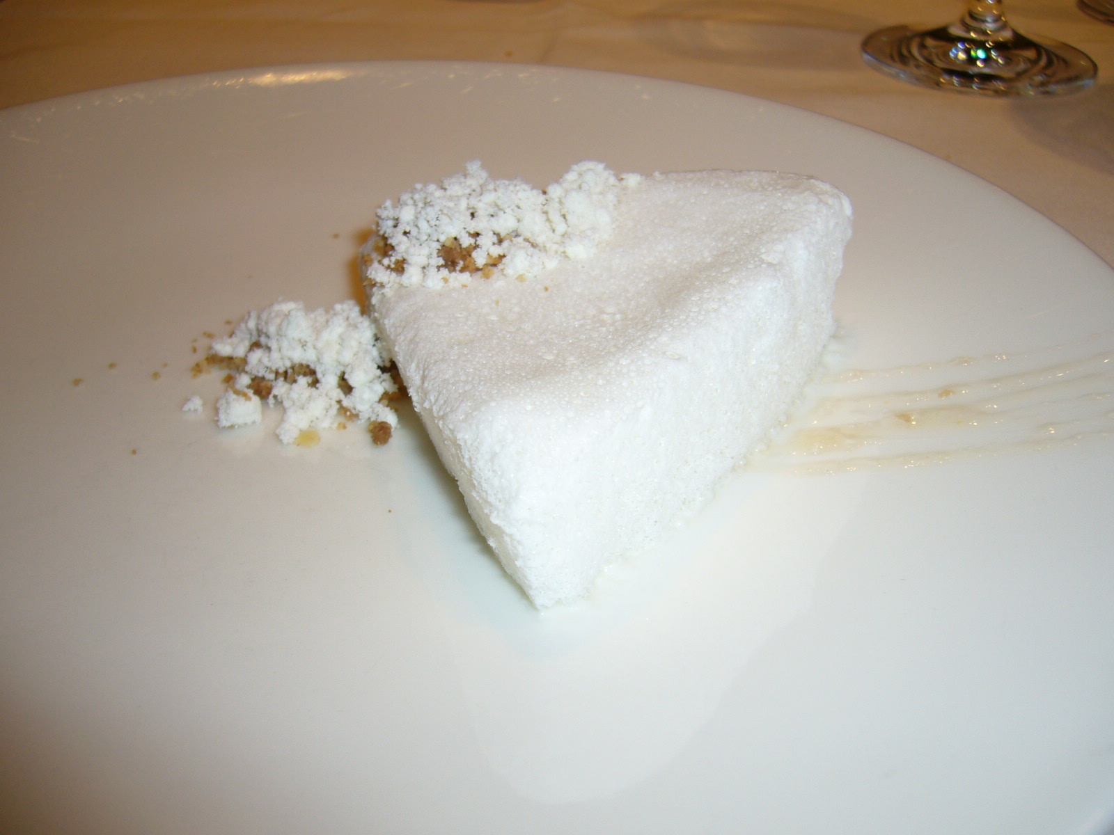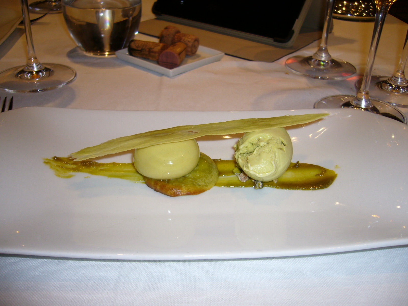 El menú comenzaba con una cuña helada de queso con aceite de hierbas, praliné y mermelada, elaborada con queso manchego y parmesano bajo una técnica de trabajo con hielo que hemos visto en otros platos de Pepe y que siempre sorprende.