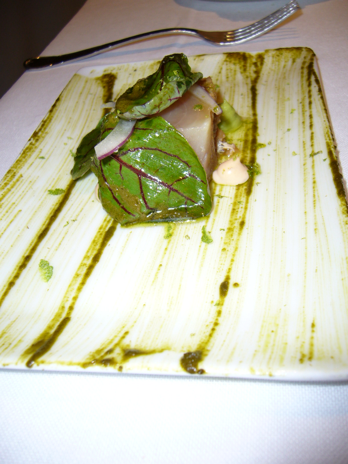 Nosotros y el queso no nos llevamos muy bien y máxime con quesos tan fuertes, no pudimos con el plato, así que nos lo cambiaron por un bonito fresco con hojas de mostaza y lima, una delicia de preparación de uno de nuestros pescados preferidos, con una fresca textura casi confitada que contrastaba con la acidez de la lima. Aquí hubo doble disfrute, tanto por del plato de queso por parte de mi mujer como del bonito por la nuestra. Un comienzo por todo lo alto.