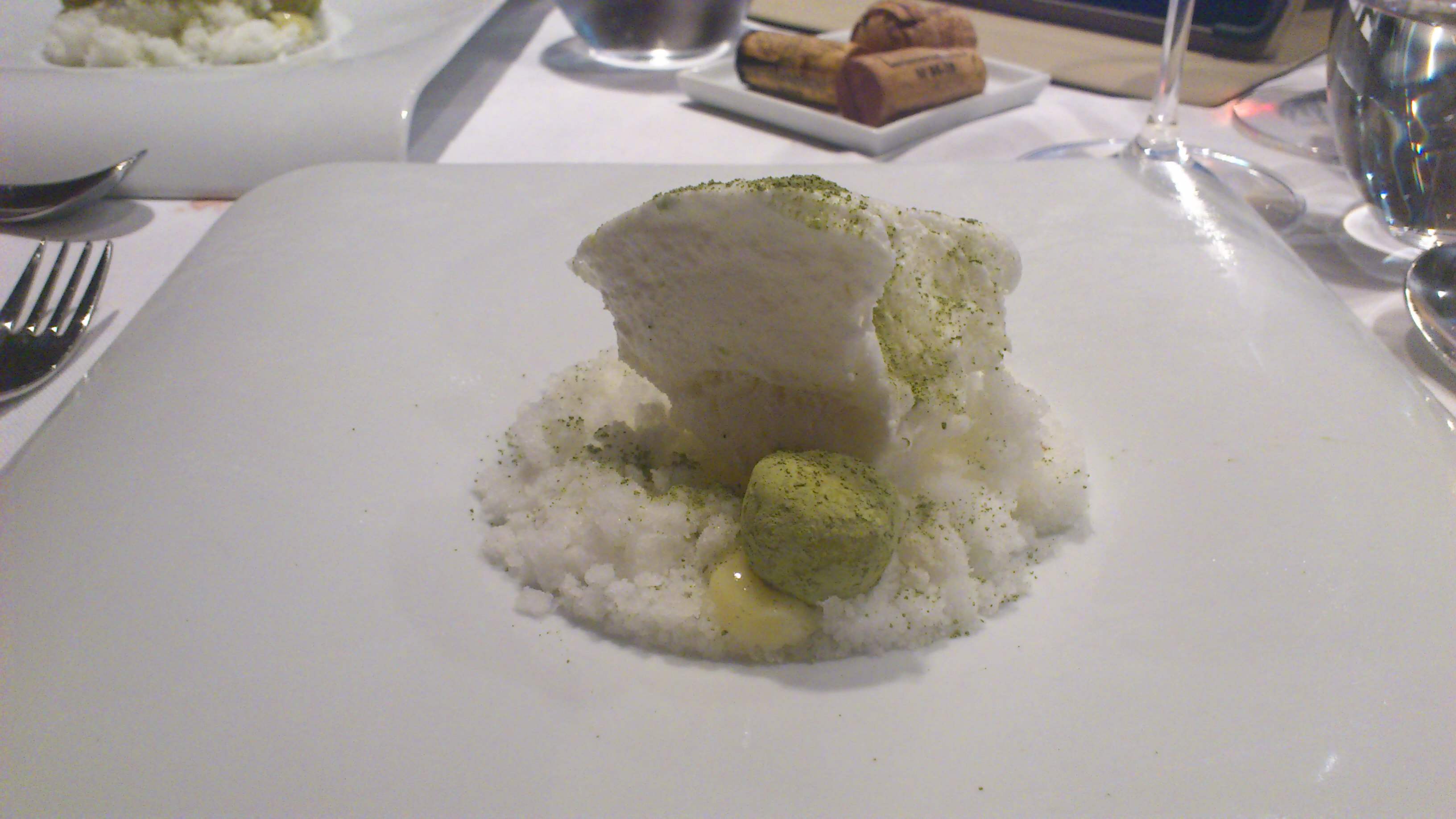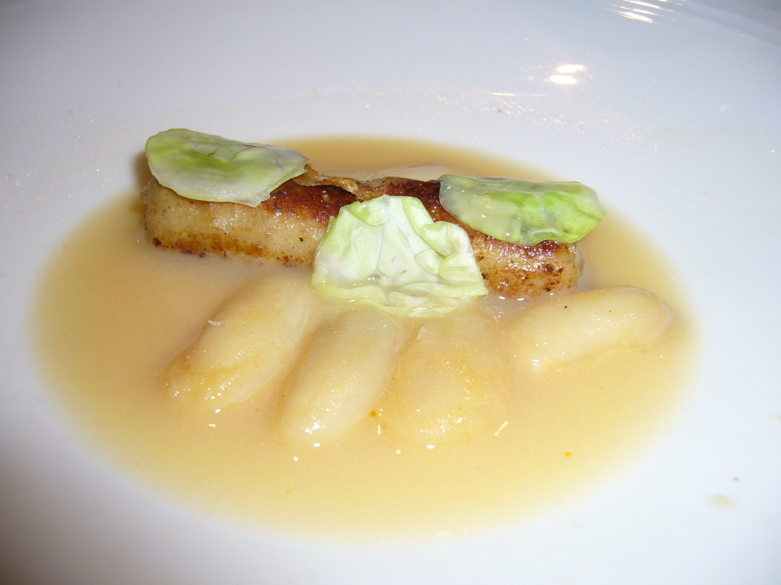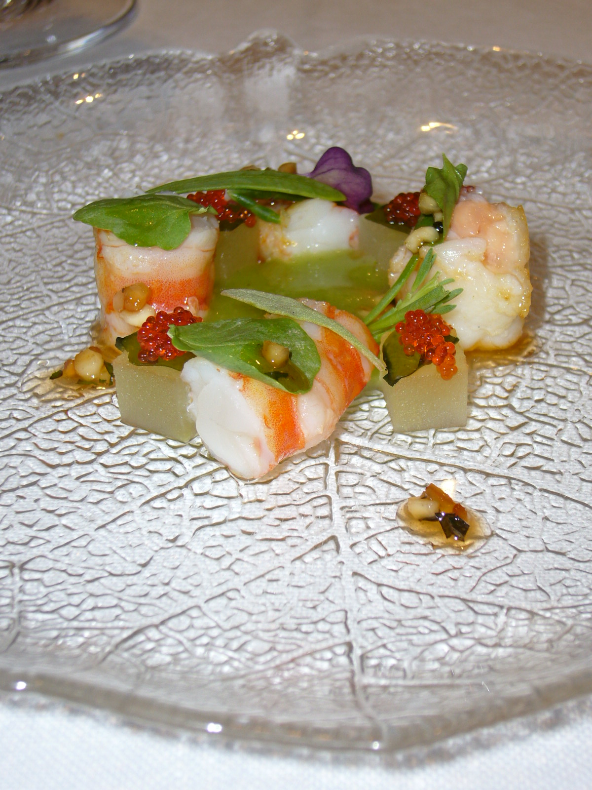 cambiantes y complejos que pasan por varias fases, a veces más frutales, otras más minerales, otras más fúngicos, otras más cítricos, una maravilla que queda casi en nada ante su paso por boca, este vino es un tornado en la boca, está joven, largo, poderoso, con una acidez inigualable, cremoso, persistente, grandioso. Tal y como fue definido, es la “join-venture” entre Bollinger y Dios. Un vino para la historia. Alucinados con la clase de esta botella, el menú continuaba con un curioso ajoblanco de coco y sandía, una preciosa composición cromática de colores rojos y blancos, presentado en un cilindro que se abría por arriba y que resultaba refrescante como nada, jugando con los sabores de la sandía, el ajoblanco y el coco. Sin ser la sandía nuestra fruta preferida, hay que decir que este plato nos encantó, llenaba la boca de frescura sin perder la esencia de esta cocina: el sabor. Después llegaron unos langostinos con ensalada de manzana verde, algas y wasabi, una deliciosa –y de nuevo fresquísima- ensalada donde un excepcional langostino sureño era el protagonista con los tacos de manzana verde y el aporte de carácter del wasabi, sin dejar de restar protagonismo al impecable crustáceo. Decía Mercedes “imposible sacar más partido a un langostino, vaya un juego de sabores”. Y no hay mucho más que comentar.