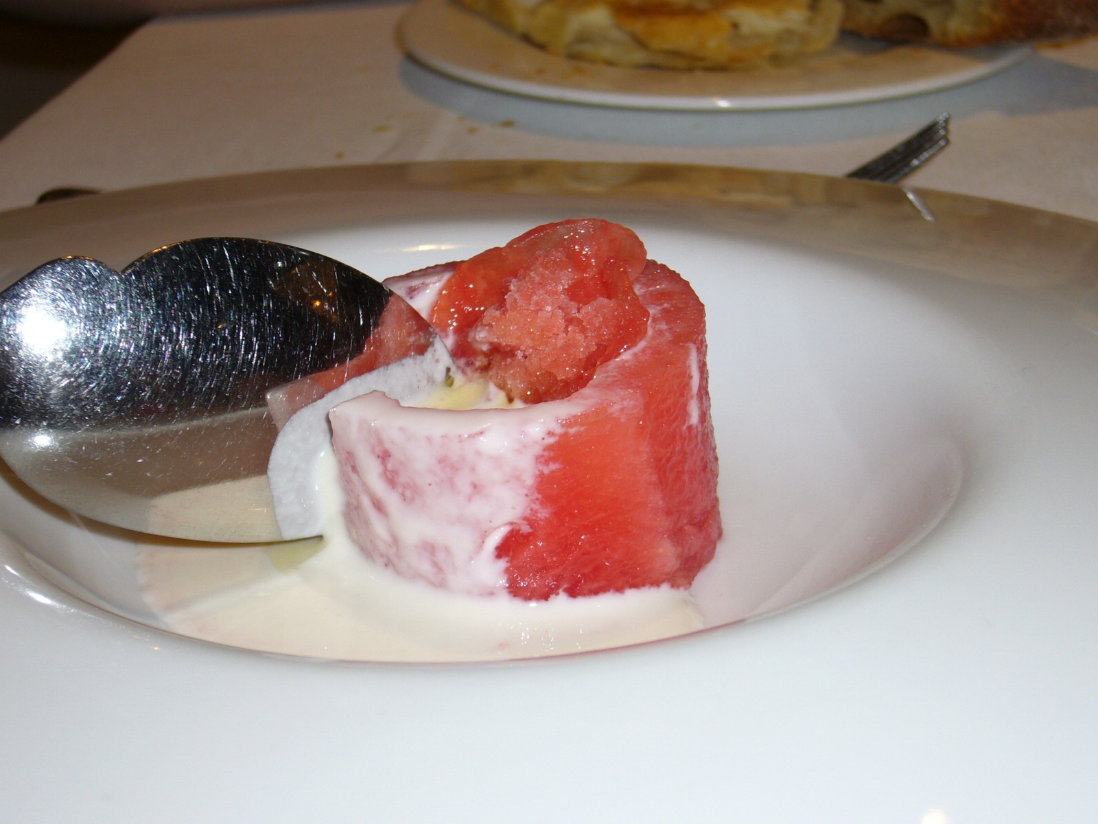 El menú similar al vuestro.Y como a veces......,llega un plato que parece complementario por su aparente simpleza de producto(recordarás aquella ensalada campera que tomamos hace dos años)pero cuya sutileza nos hace comprender en qué categoria de restaurante estamos.Ajoblanco de coco y sandía.