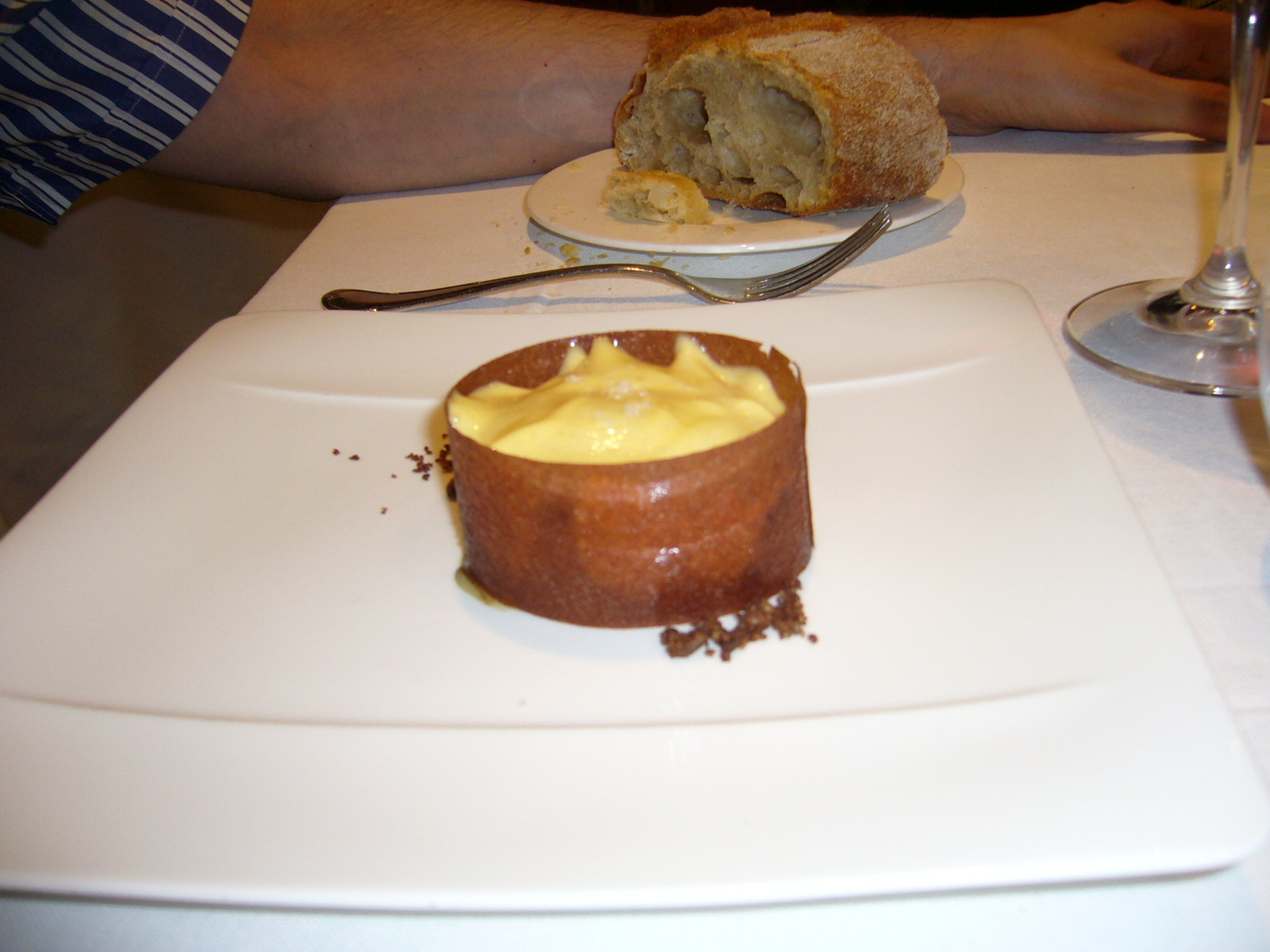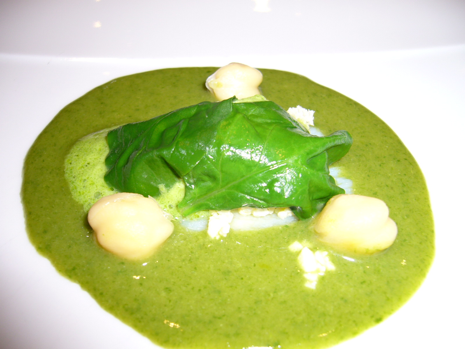El menú continuaba su curso con un soufflé de setas a la brasa, una preparación basada en setas de estío como perrechicos y senderuelas y presentada dentro de un fino cilindro de chocolate, coronada por una yema de huevo. De nuevo nos sorprende el juego de sabores y texturas propuesto en uno de esos platos que se quedan cortos porque resultan adictivos. Setas, huevo, chocolate...en fin, una delicia más. Llega a la mesa una atractiva composición de tonalidades verdes que al olerla ya nos dice algo especial. “Huele a mi potaje de bacalao, me decía mi mujer”. En efecto, se trata de la versión que aquí elaboran del tradicional plato de la cuaresma castellana y que Pepe borda en toda su grandeza con su bacalao, su espinaca y sus garbanzos, uno de esos platos tradicionales que alcanzan categoría de alta cocina en este restaurante y cuyo caldo de nuevo obliga a mojar pan, algo habitual comiendo en esta casa, además y aunque no solamos hablar mucho del pan, es algo que aquí se cuida mucho y bien.