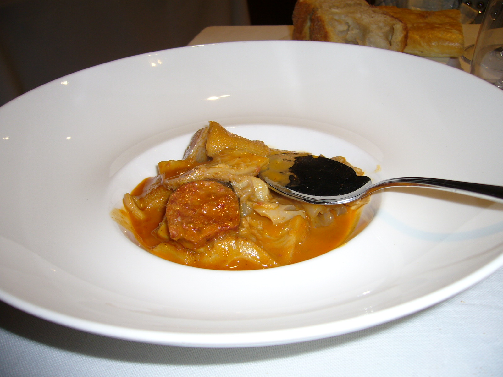 les recetas de cuchara con las que Pepe nos obsequia, una delicada salchicha de corte especiado acompañado por unas alubias que son pura mantequilla y lo mejor del plato, el caldo, uno de esos caldos que son pura esencia sápida, pura concentración de sabores, una maravilla.