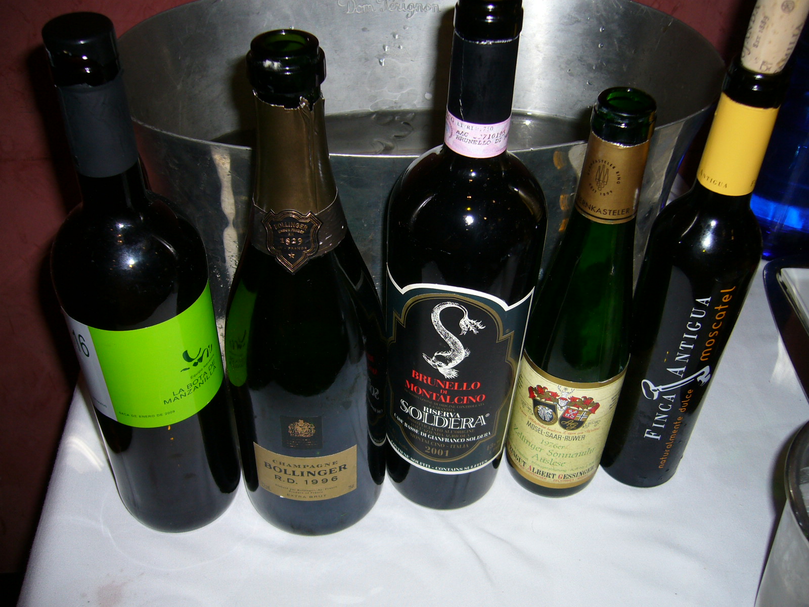 Antes de los postres abrimos la tercera botella que aportamos al festín, un Gessinger Zeltinger Sonnenuhr Riesling Auslese 1976. Bueno, realmente estaba abierta desde la mañana para favorecer su aireación, algo fundamental en este tipo de vinos. Albert Gessinger es un productor del Bernkasteler-ring, una división situada por calidad un poco por debajo de los grandes del VDP Mosel, de los nombres como Egon Müller, JJ Prüm, Fritz Haag o Maximin Grünhauser, pero del que hemos probado algunos vinos francamente interesantes, en especial los de este soberbio pago Zeltinger Sonnenuhr. Este vino en concreto era la segunda vez que lo catamos y de nuevo cumplió expectativas. Hay que tener en cuenta que hablamos de una añada cálida y legendaria en los vinos más dulces y lo cierto es que el vino resultó fiel a su añada con registros espectaculares en nariz, complejo, intenso, realmente atractivo por su multitud de aromas, resultando en boca más ancho que largo, manteniendo acidez y siendo sabroso y potente, un poco falto de verticalidad pero siempre encantador por su accesibilidad. Un vino que ha respondido siempre y que habla muy bien de este productor, cuyos precios resultan atractivos en comparación con los de otras bodegas de la zona aunque a la hora de la verdad tampoco podemos situar sus vinos a la altura de los mejores. En cualquier caso, un perfecto ejemplo de riesling del Mosela en plena madurez que disfrutamos mucho y que por cierto, a Pepe le fascinó. Después le preguntamos a José Carlos por algún vino manchego interesante de postre y nos puso un par de copas de un moscatel de Martínez Bujanda (Finca Antigua Moscatel Naturalmente Dulce), que nos pareció realmente bueno, fresco, equilibrado, muy rico. Obviamente está en niveles distintos a los vinos anteriores, pero nos gustó mucho y resulta más que recomendable, además a un precio muy justo.