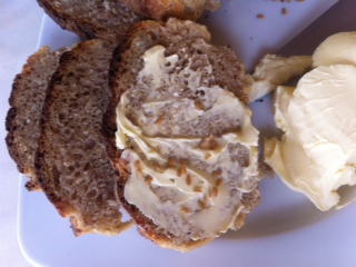 La receta viene de nuevo de la mano de Kristin (www.kristineherenborg.com) y se distingue de las otras que he publicado en la manera en que lleva solamente masa madre y ninguna levadura fresca. La cantidad de masa madre es bastante más grande que en otras recetas y por eso tienes que preparar la tuya un día o dos antes, añadiendo más harina y agua para que tengas la cantidad suficiente (405 gramos para la masa más 60 – 100 gramos como una base para seguir con tu masa madre y no perder todo!). El problema de confiar solamente en la fuerza de la masa madre para la fermentación es que en casa es bastante difícil obtener la temperatura ambiente suficiente y controlada para que se fermente bien la masa. Tampoco tenemos las masas madres en forma perfecta con súper fuerza cuando tenemos ganas y tiempo de hacer pan ….Ahora en Julio en Valencia la temperatura es ideal para fermentar la masa madre pero es cierto que si repitiera esta receta en invierno igual me costraría más que quedara tan esponjoso, por eso un truco es añadir unos gramos de levadura de panadería y así nos aseguramos de que saldrá perfecto. La foto que os pongo la hice sólo con masa madre, y la verdad es que salió fenomenal, pero también es cierto que estábamos a 30ºC!.