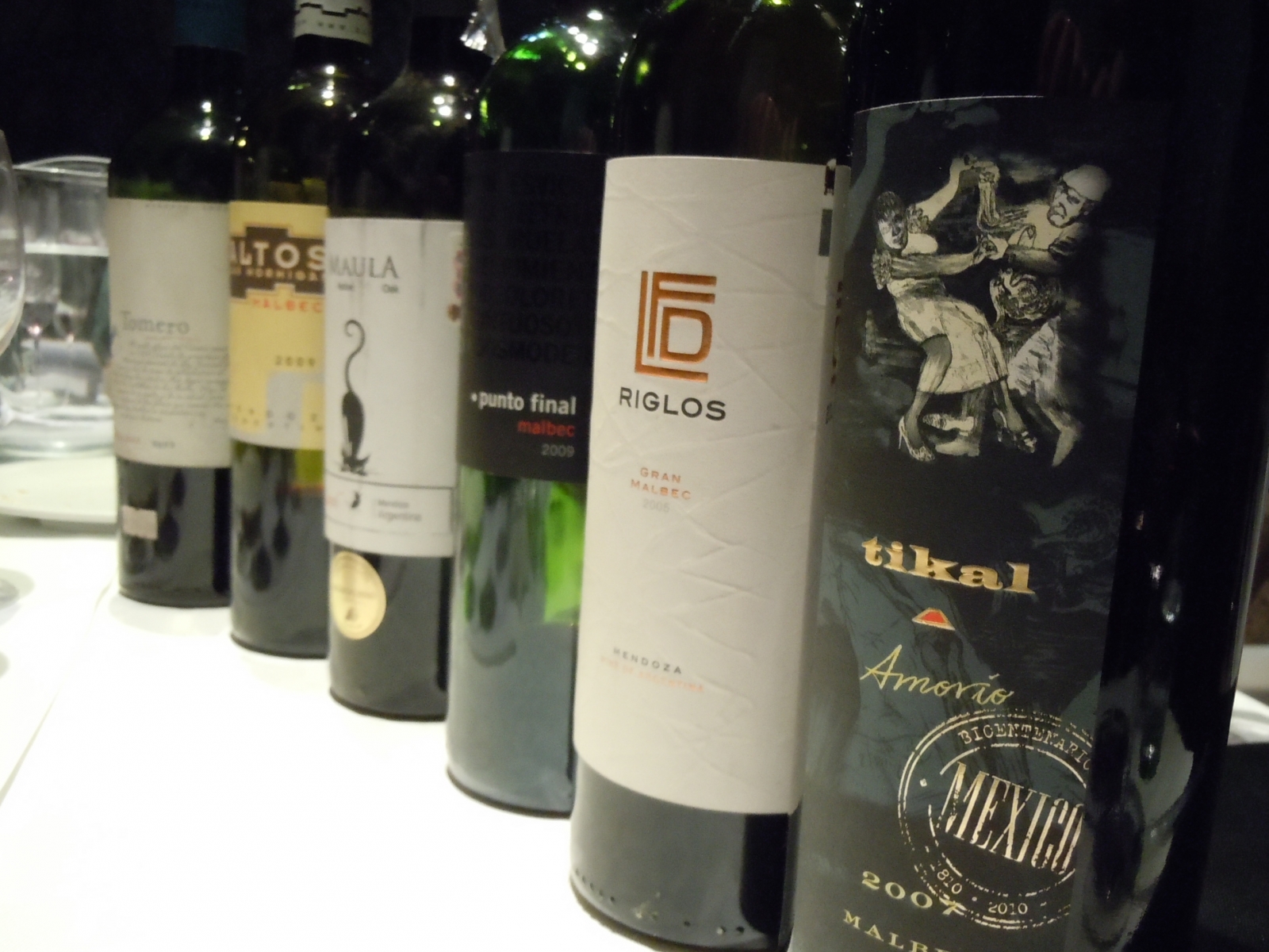 El primer malbec es Tomero 2008, de bodegas Vistalba, nariz frutal: frambuesa y fresa, en boca es astringente con una arista de alcohol, sus 14,4 grados son evidentes a pesar de estar a buena temperatura. Altos Las Hormigas 2009, es bastante popular por diferentes tiendas incluido Costco. Huele a hollejos, mermelada de zarzamora con algunas notas verdes, en boca es frutal y sabroso. El tercero ha gustado mucho a la mayoría, Maula 2006, el más amalgamado de todos, con aroma a higos cristalizados, fruta roja en sazón. En boca es de taninos suaves, buena acidez, muy redondito.