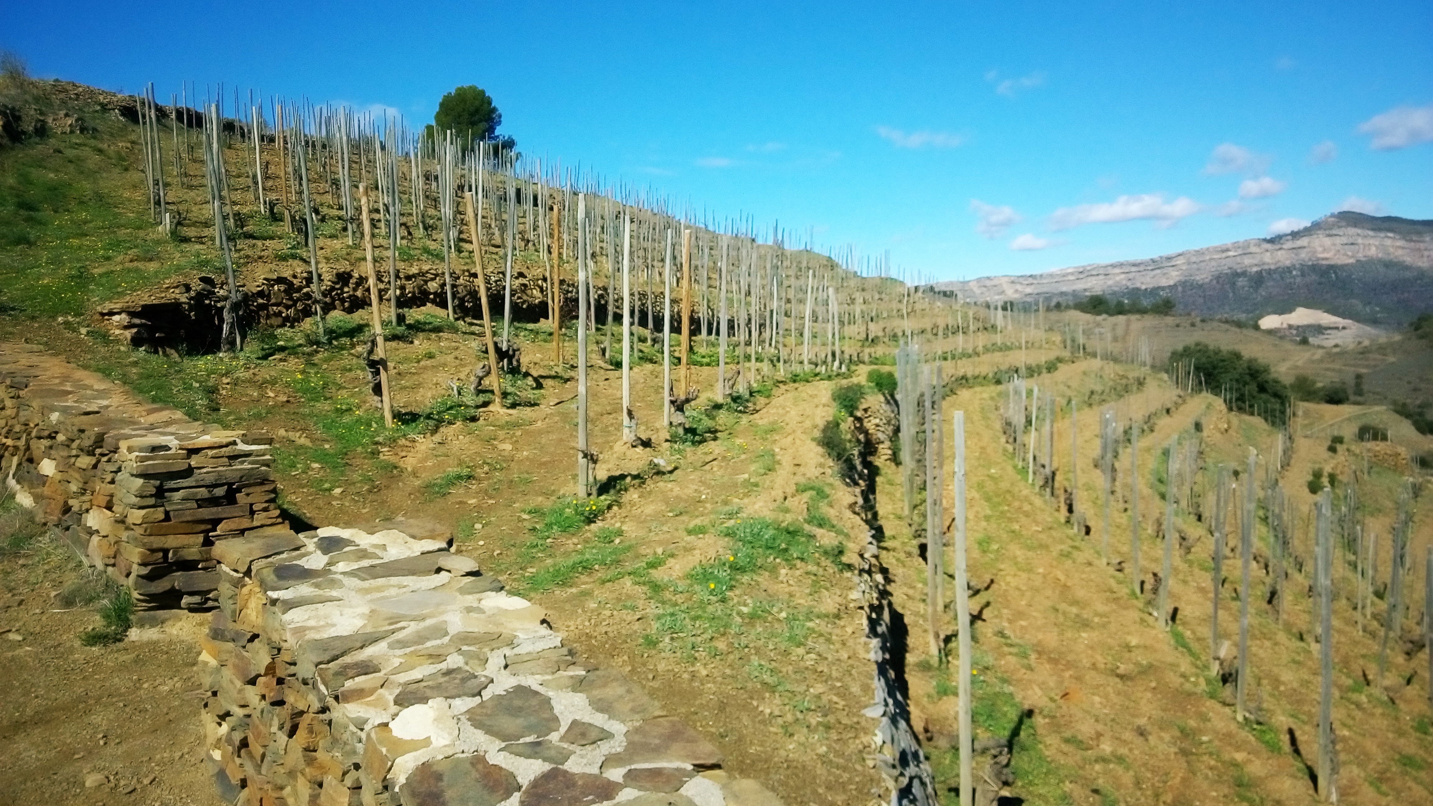 Cambiamos totalmente de orientación y nos trasladamos a la finca de l’Ermita, penetramos dentro de ella, observamos las viñas como se agarran a la montaña, viñas de entre 80 a 114 años, pequeñas, con un crecimiento lentísimo, su vigor es el grano de uva y el apego al territorio. Esta viña transmite paz y sosiego envuelta en el bosque mediterráneo. Desde allí se observa la nueva eclosión del Priorat, arañando al bosque con los nuevos viñedos, que no hacen, sino recuperar el terreno perdido del esplendor anterior. Atendemos a las palabras de Elena, su pasión y dedicación, su esmerado trabajo, transmite su alegría por pertenecer a este proyecto, se aprecia como se lo gana día a día, el apego a la tierra, los vaivenes de la climatología, el rigor de la sequía, la ilusión por las nuevas añadas.