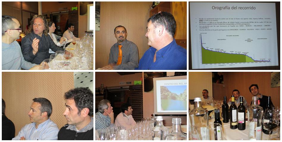 La cata empezó con un PowerPoint haciendo un recorrido desde el nacimiento a 2.160 m en Duruelo (Soria) y recorriendo los 897Km de los cuales 572 km son territorio español 112 km fronterizos compartidos, y 213 km portugueses, hasta su desembocadura en Portugal. Este recorrido consistía en visualizar fotos de cada una de las zonas por donde pasaba el Duero, enumerándolas para posteriormente, intentar averiguar a qué zona pertenecían los vinos catados a ciegas, e intentar identificar el tipo de uva y añada.