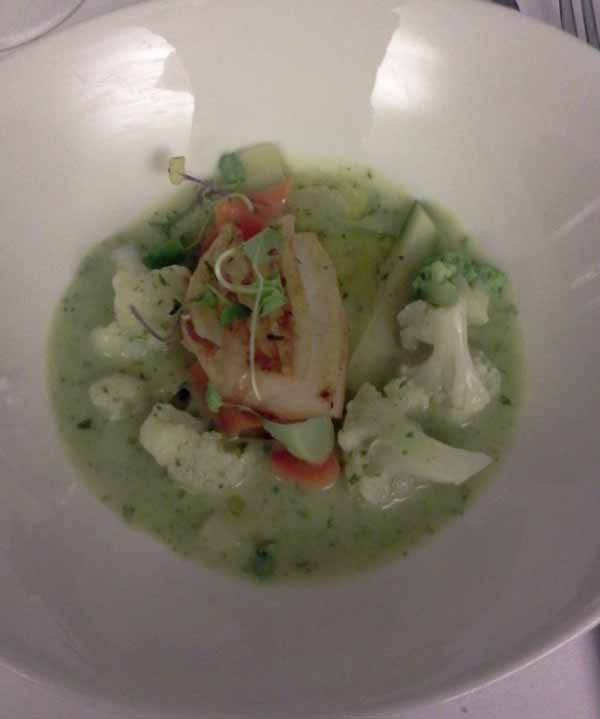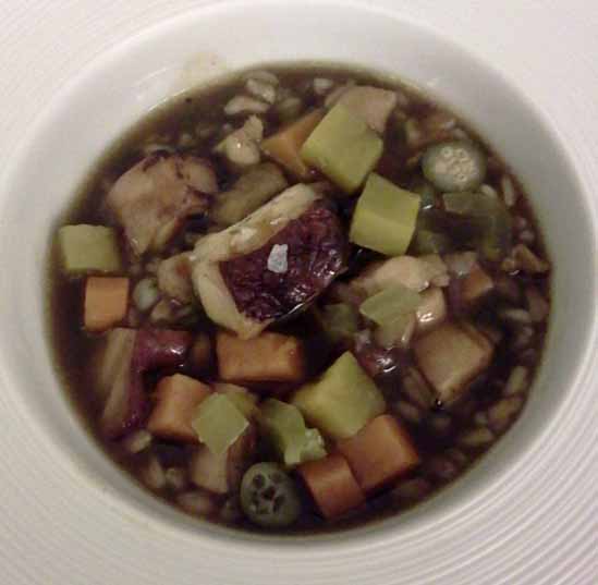 Continuamos con una menestra con sepia, muy buena combinación de verdura en su punto con una magnífica sepia tierna y jugosa. Seguimos con Farro con pulpo. Farro es la denominación italiana de una variedad de espelta (spelta triticum), cereal de grano fino y tierno de apariencia similar al de trigo que resultaba muy ligero y agradable acompañamiento del pulpo a modo de pasta. Proseguimos con un Risoto con panceta y setas para terminar con una deliciosa presa ibérica y un surtido de postres. Respecto a los vinos, comenzamos con un Atalaya do Mar 2012, fresco y floral Godello de la zona de Monterrei. Continuamos con un Albariño, Terras Gauda 2012, un valor seguro con sus notas cítricas y tropicales y un fondo mineral. Terminamos probando un obsequio de M. Balaran de Domaine D’Escausses en Gaillac: Cuvée des Drilles 2012. Un Gaillac fresco y afrutado, lleno de fruta roja con matices minerales y especiados.