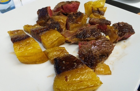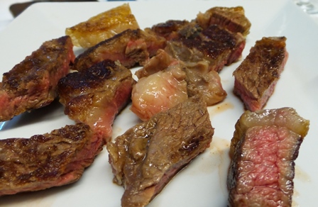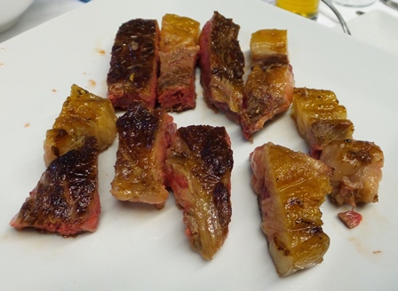 Se produce en mí una curiosa contradicción. Si bien cada vez tomo menos carne de forma regular, el producto me interesa cada vez más y disfruto como nunca con las buenas piezas. Es curioso como en mi infancia, cuando la carne era considerada como el paradigma de la buena nutrición, la aborrecía. Con la edad aprendí a comerla, prepararla y saborearla. En mi casa su consumo fue creciendo de forma pareja al que, probablemente, tuvo en el consumidor medio español. No obstante, con el comienzo del siglo XXI se produjo un cambio en mi tendencia y ya había iniciado un descenso en su consumo, incluso antes de que se desencadenara la infausta “crisis de las vacas locas”. No obstante, conforme se reducía su presencia iba constatando que su consumo ocasional era cada vez más gustoso. Desde que probara las carnes de María José y Darío -a quienes debo una visita- en Araguaney se abrió un mundo de sensaciones. Desde entonces he probado carne muy buena y algunas piezas excepcionales, de llorar. ¿Sencillo? ¿Simplemente producto? Sí y no. Desde luego la base es un buen género; condición necesaria. Por eso me interesa este curso, porque quiero conocer en profundidad los factores que afectan a su calidad. Pero no suficiente. Estoy constatando que su preparación, en contra de lo que cabría suponer, no es en absoluto trivial. La forma de cocinar, el punto, la temperatura, la sal y el servicio son factores que pueden arruinar la mejor pieza del mundo, aunque no ensalzar la peor. No obstante, es preciso reconocer que, en general, en los restaurantes se están cuidando cada vez más todos y cada uno de los factores mencionados.