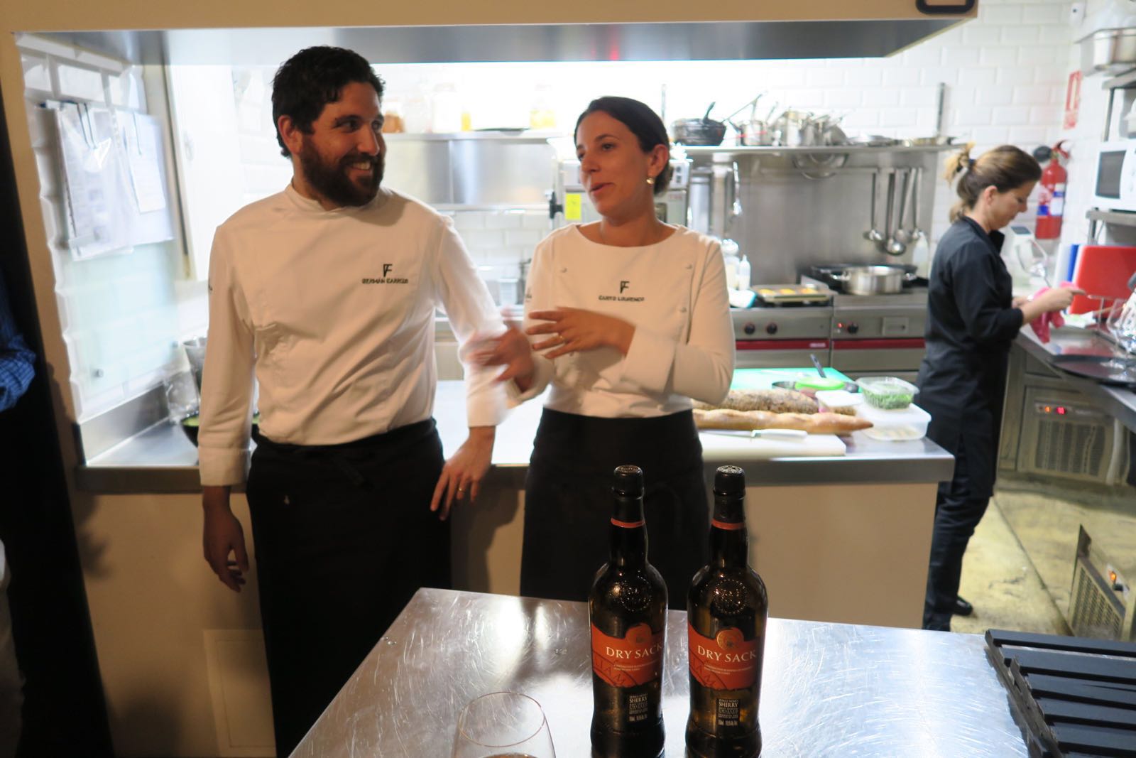 vista de la preparación de unos platos que salen inmediatamente al servicio. ¿Dudas, comentarios, sugerencias? Inmediatamente, al instante, a los cocineros… Obviamente no hay carta, el menú está en manos de Germán y Carito que, a su vez, tienen en cuenta lo que han ofrecido en visitas previas a los visitantes repetidores. Ventajas de la proximidad. En “sala” atiende la sumiller Eva Pizarro, ¿se puede pedir un mejor equipo? Estoy seguro de que alguien con su pareja se podría haber sentido como Jeff (James Stewart) en la Ventana Indiscreta, con el menú del Club 21 en su apartamento servido por Lisa (Grace Kelly)…. Aunque, ahora que recuerdo, no nos prepararon langosta ni Eva nos descorchó un Montrachet y, lo que es peor, me acompañaba una caterva de maromos. Volviendo a la realidad debo decir que, sinceramente, me parece una idea tan bonita como arriesgada, destinada, no obstante, a triunfar. Apoyo mi vaticinio en la ilusión que tienen y la pasión que pone la pareja formada por Germán y Carito. Están a gusto, hacen lo que quieren, disfrutan y hacen disfrutar. No hay más que decir, sólo sentarse y gozar.