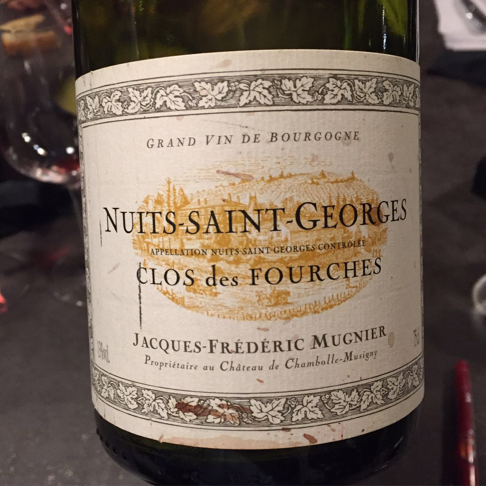 100% Pinot Noir. Nuits-Saint-Georges A.O.C.. Vol. 13%. Domaine Jacques-Frédéric Mugnier, Rue de Vergy, 21220 Chambolle-Musigny, Francia.
