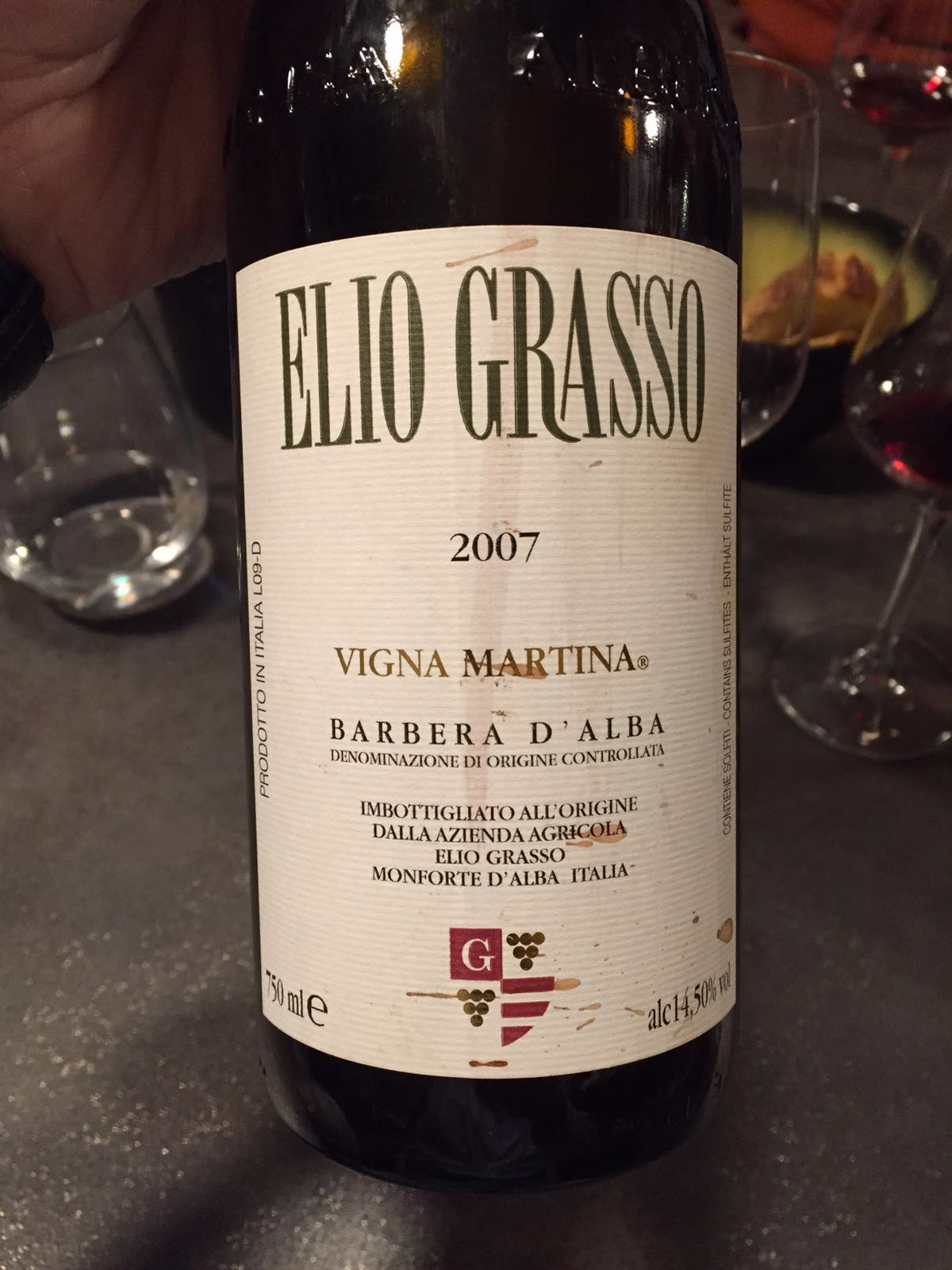 100% Barbera, Barbera d'Alba DOC . Vol. 14,5% Azienda Agricola Elio Grasso, Via Ginestra, 12065 Monforte d'Alba, Italia.