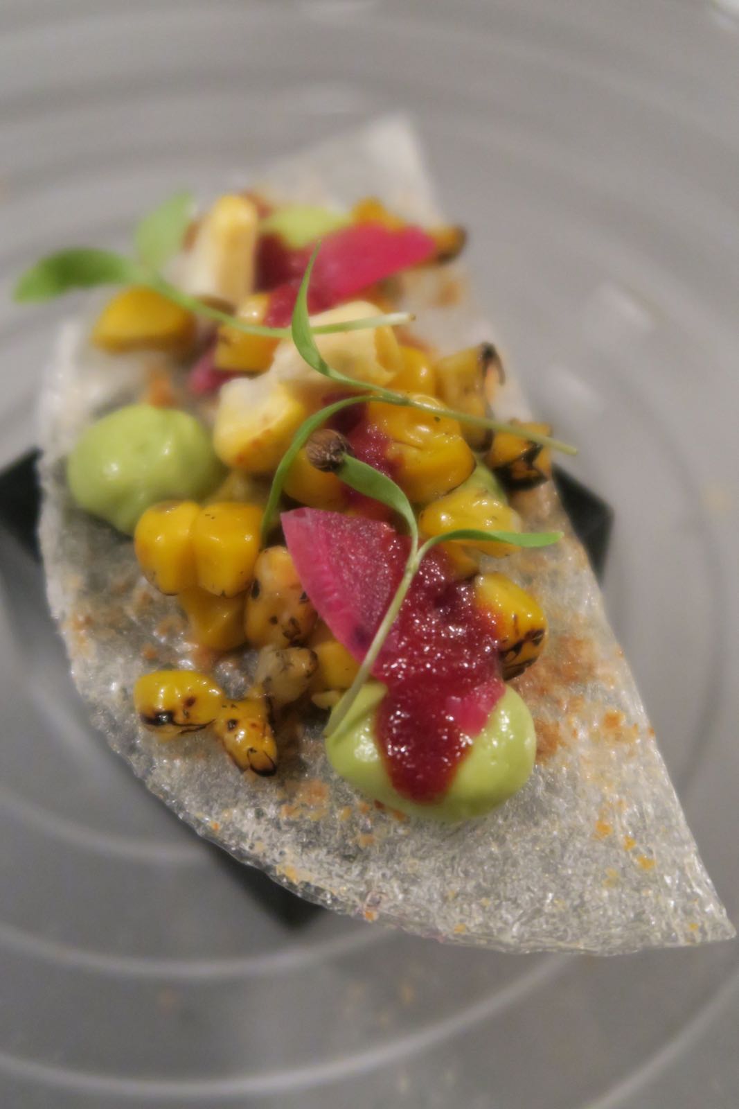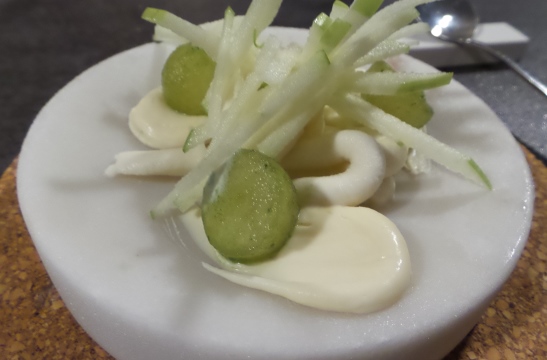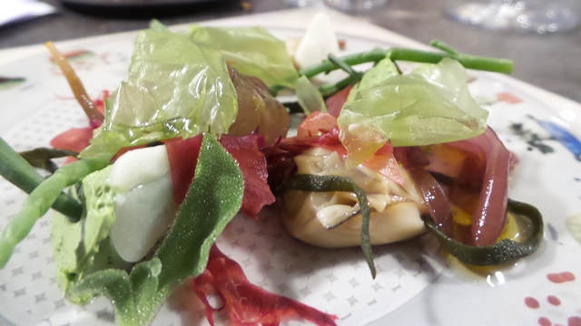Comenzamos con unos deliciosos snacks que se iniciaron con un bonito ibérico, un corte de bonito sobre una corteza aderezado; taco de guacamole, precioso, con una tortita bien crujiente sobre la que descansa el maíz aderezado con cebollita, habitas y salsa ligeramente picante; una media luna de foie mi-cuit envuelto en manzana, espectacular, y una empanada criolla, receta familiar de Germán. Hubiéramos cenado repitiendo una y otra vez los entrantes hasta la hartura. Los acompañamos con una manzanilla la Gitana en Rama. Fresca pero compleja y amplia y con esa sapidez que acompaña tan bien las entradas. Continuamos con una ensalada de algas y ostras que acompañamos de Fino Coquinero. Perfecta conjunción de salinidad marina en el plato y en la copa. Seguimos