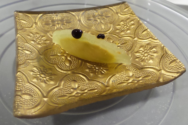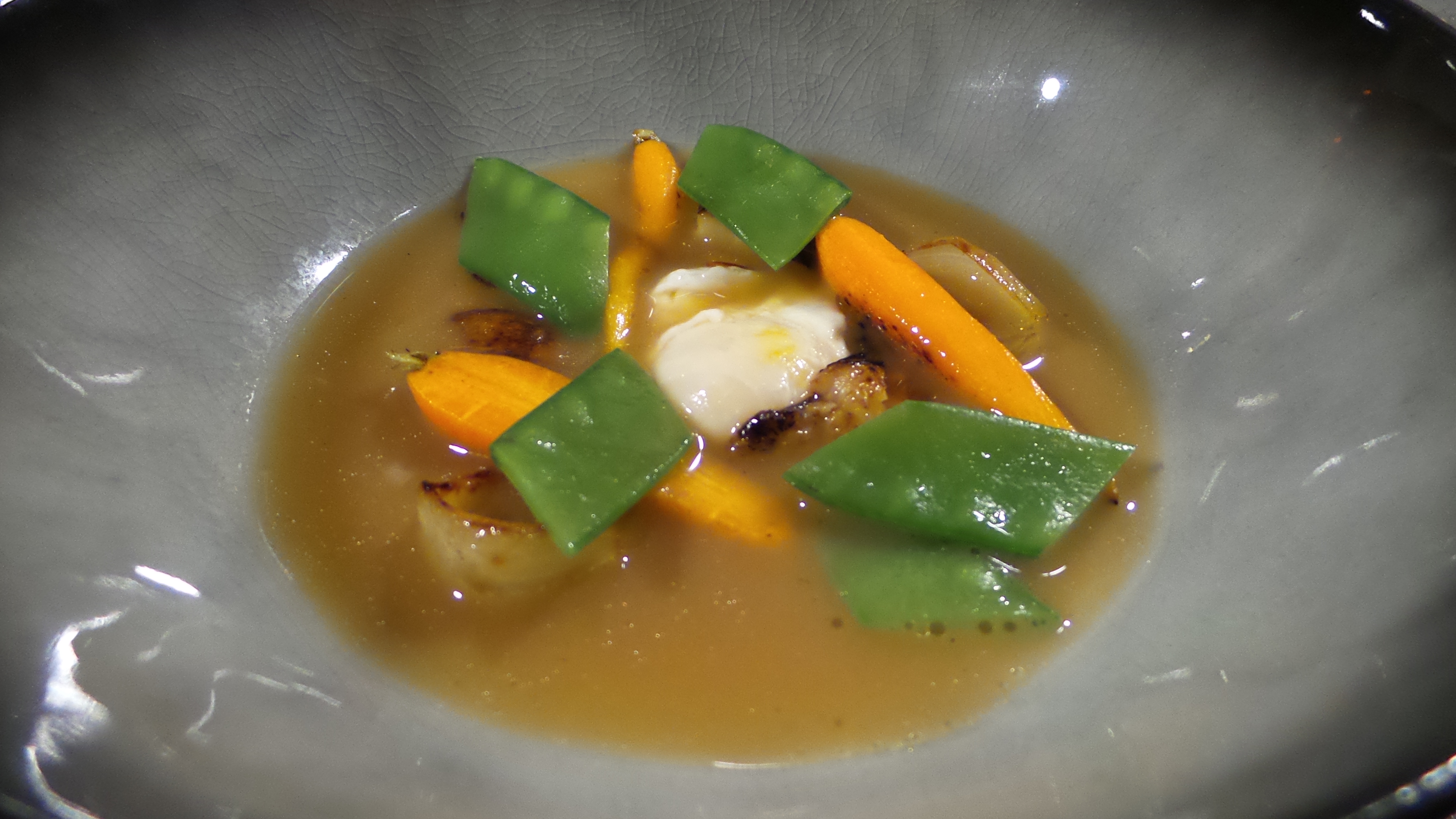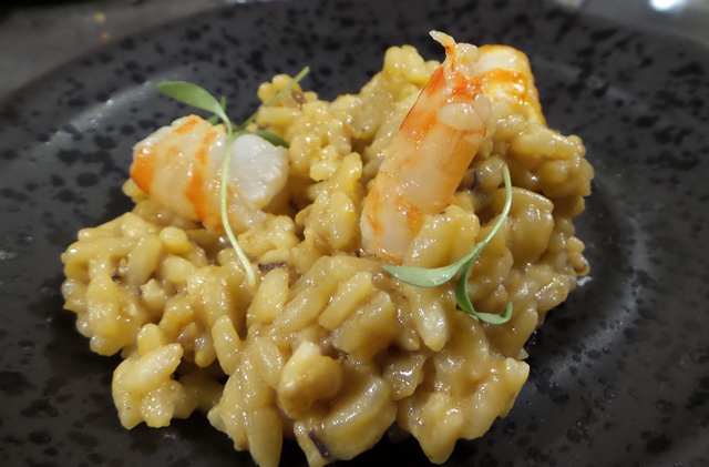 con unas verduras con curry verde, verduras de temporada con una cocción muy ligera en un caldo de curry templado, y unas mollejas, tiernas y cremosas por dentro y doraditas por fuera, magníficas. Estos dos platos fueron acompañados de Amontillado Tío Diego de Valdespino que armonizó muy bien platos de sabores más complejos, especialmente las verduras con curry, plato difícil de acompañar y con el que demostró, una vez más, la versatilidad gastronómica de los vinos de Jerez. Le siguió un arroz con galera y langostino y con el mar volvió la manzanilla, Manzanilla Pasada Soluqua. Sensacional arroz justo en su punto de meloso y lleno de sabor, perfectamente acompañado por una dama clásica con un traje moderno: Manzanilla pasada en el límite de su crianza biológica de 10 años, intensa, seca y amplia, dando el contrapunto perfecto a la untuosidad del arroz. Llamativo el etiquetado de Bodegas Barón con un diseño de botella y etiqueta jovial y juvenil. Si el atrevido diseño me llamó la atención, sorprendente entre botellas de un perfil clásico como el que predomina entre los vinos del Marco, no me parece mal en