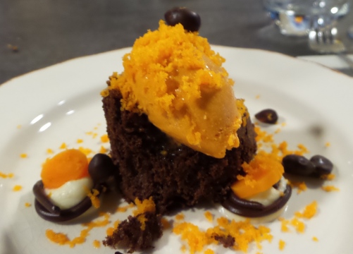 absoluto que se rompa con los moldes si queremos popularizar los vinos de Jerez, especialmente entre los más jóvenes. Terminamos los principales con un solomillo 5 Jotas. Solomillo de cerdo ibérico asado, tostado por fuera y tierno y jugoso en su interior, sobre una hoja de col con una vinagreta aliñada muy fresca. Lo acompañamos con una verdadera joya enológica: el Palo Cortado Dos Cortados de Williams & Humbert. Procedente de una solera de más de 20 años, elaborado con Palomino procedente del Pago Balbaína, es un vino potente pero elegante y complejo, con una nariz elegantísima en la que están las notas de la crianza biológica y de la oxidativa. Con esa presencia en boca tan característica en la que combina el amontillado seco con los matices amables y untuosos de oloroso. Magnífica armonía y equilibrio. Muchas satisfacciones me está dando revisitar los grandes vinos viejos de una bodega tan clásica como inadvertida en nuestro país. Terminamos con dos postres de la mano de Carito. Mi preferido, un delicioso, fresco y fragante sorbete de tomillo y manzana muy equilibrado en todo: aromas, dulzor, frescura… Nos abrió el camino al último postre, una esponja de chocolate con zanahoria y