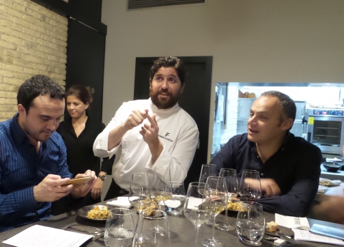y Carito Lourenço. Bastará con recordar que ellos eran los jefes de cocina del Poblet en el momento de conseguir la estrella Michelin. No hace mucho que se han embarcado en dos interesantes proyectos. El primero, Tándem Gastronómico, es un centro de asesoramiento y formación gastronómica. El segundo, Fierro, es el local de trabajo de la pareja y, además, un restaurante con una sola mesa para 12 personas. Esta idea tiene sus ventajas y sus inconvenientes. Entre los segundos habría que apuntar la limitación del horario de apertura y, sobre todo, la incomodidad que para mucha gente puede suponer el hecho de tener que compartir mesa con unos desconocidos. No voy a discutir la oportunidad de este tipo de mesas que tienden a proliferar en nuestros días como si fueran el último grito y que eran tan usuales antaño en la fonda o en la tasca de muchos pueblos pequeños. Lo cierto es que quizá no estemos acostumbrados a ello. No obstante, las ventajas son innegables si se trata de un grupo homogéneo como era nuestro caso. Porque, indudablemente, la mejor baza de este pequeño local es la cercanía. La cercanía a la cocina, a Germán y Carito. La tendencia a meterte en la cocina abierta, al fondo. La