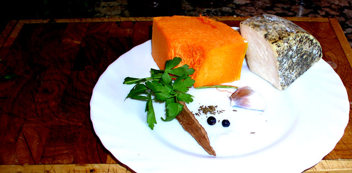 Segundo tostamos en una cucharadita de aceite (tea spoon) los cominos y el diente de ajo, los dos granitos de enebro, el bizcochao, la sal y el perejil, etc... y añadimos los trozos de calabaza.