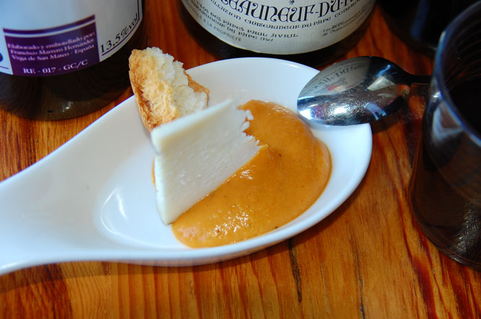 1 lasquita de queso de La Gomera (como dije arriba) o algun similar. Hay uno bueno de Tenteniguada “Roque Grande” semicurado, intenso y soculento. Va muy bien con borgoñas (pero no abusen de este “maridaje”, es discutible).
