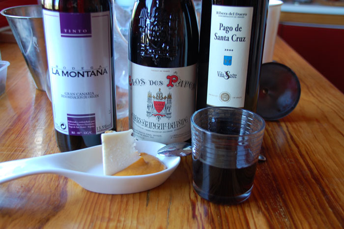 Se acompaña (no maridar) con tintorros al gusto, unas lasquitas de queso que ya hemos mencionado y con el mando del televisor vas pasando canales hasta que encuentres lo que buscas. Un vasito mas de vino (el Clos de Papes o el Santa Cruz e incluso listan negro de La Montaña).